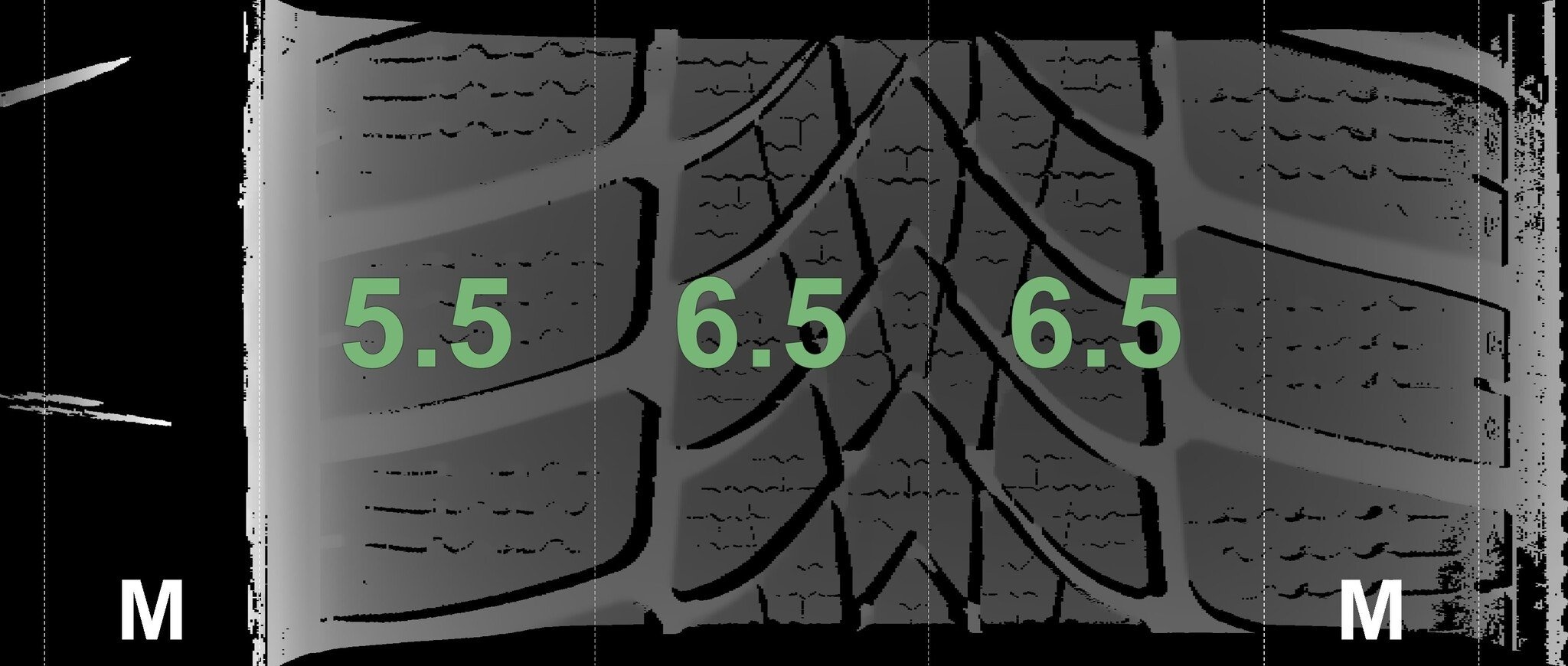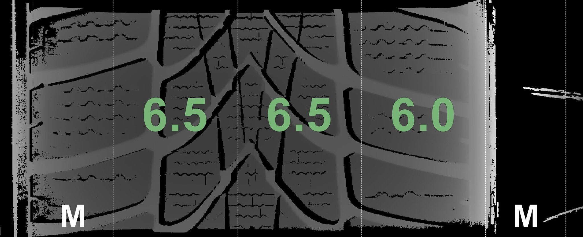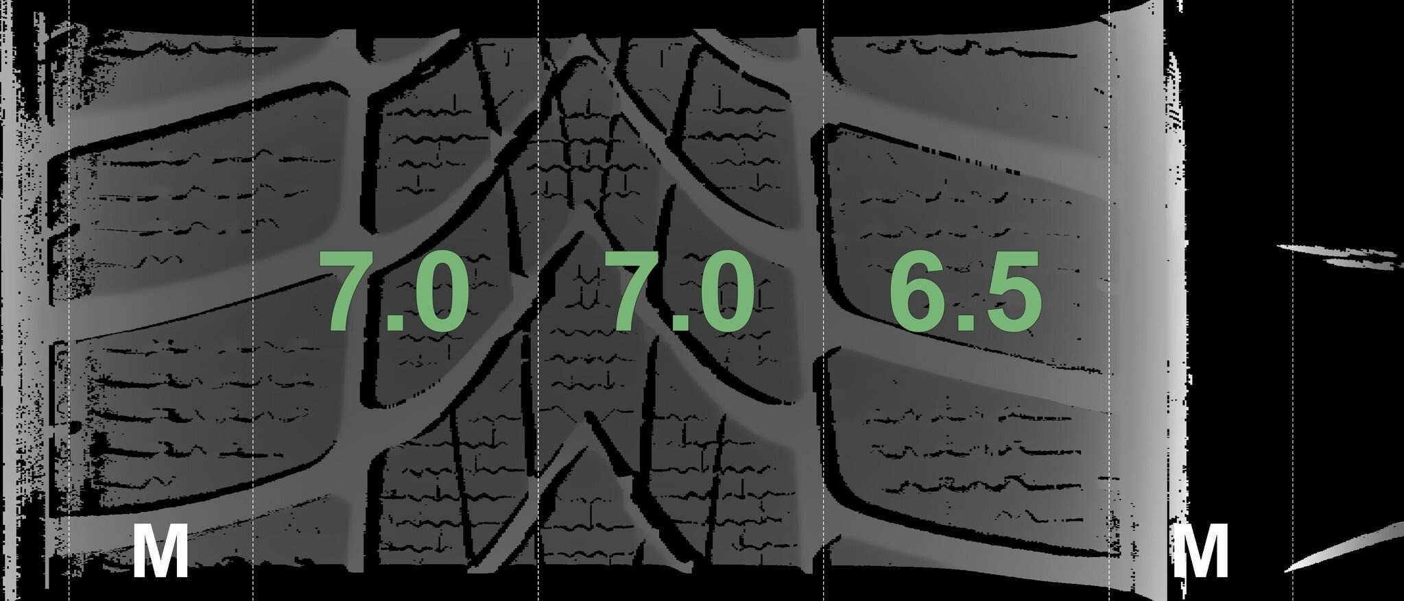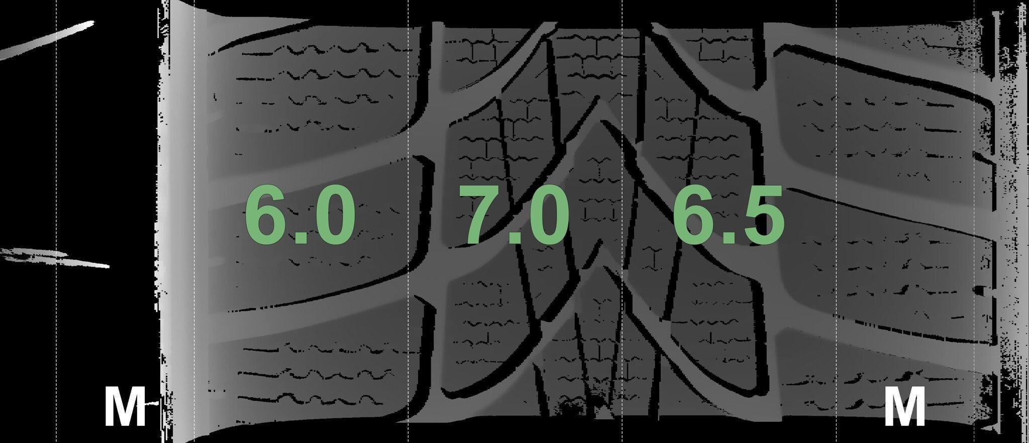 De gemeten profieldieptes en de details van de velgen zijn hierboven weergegeven.