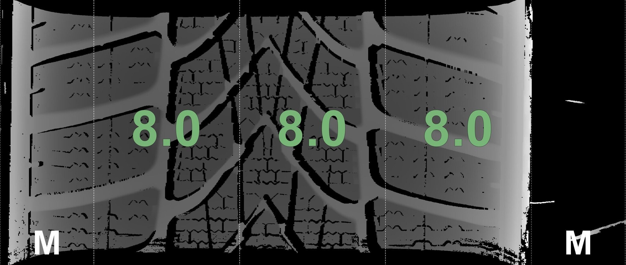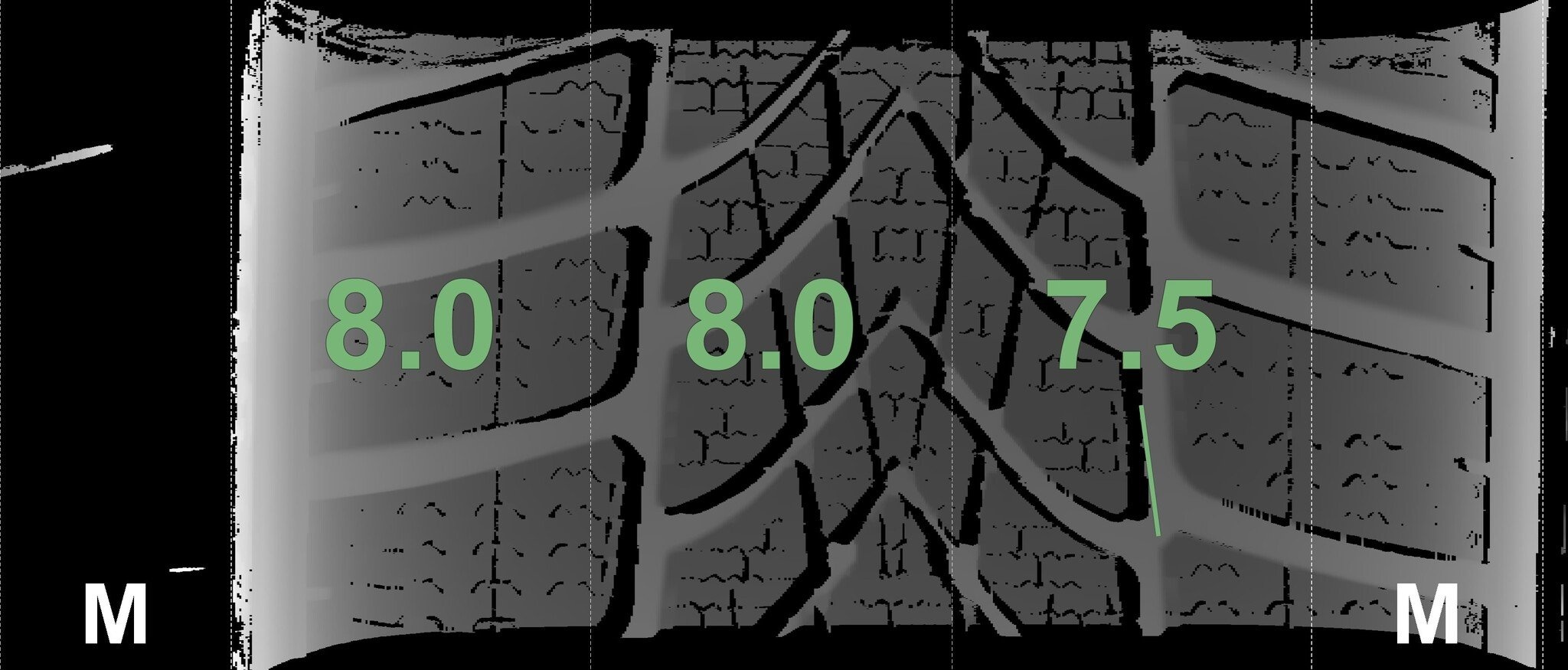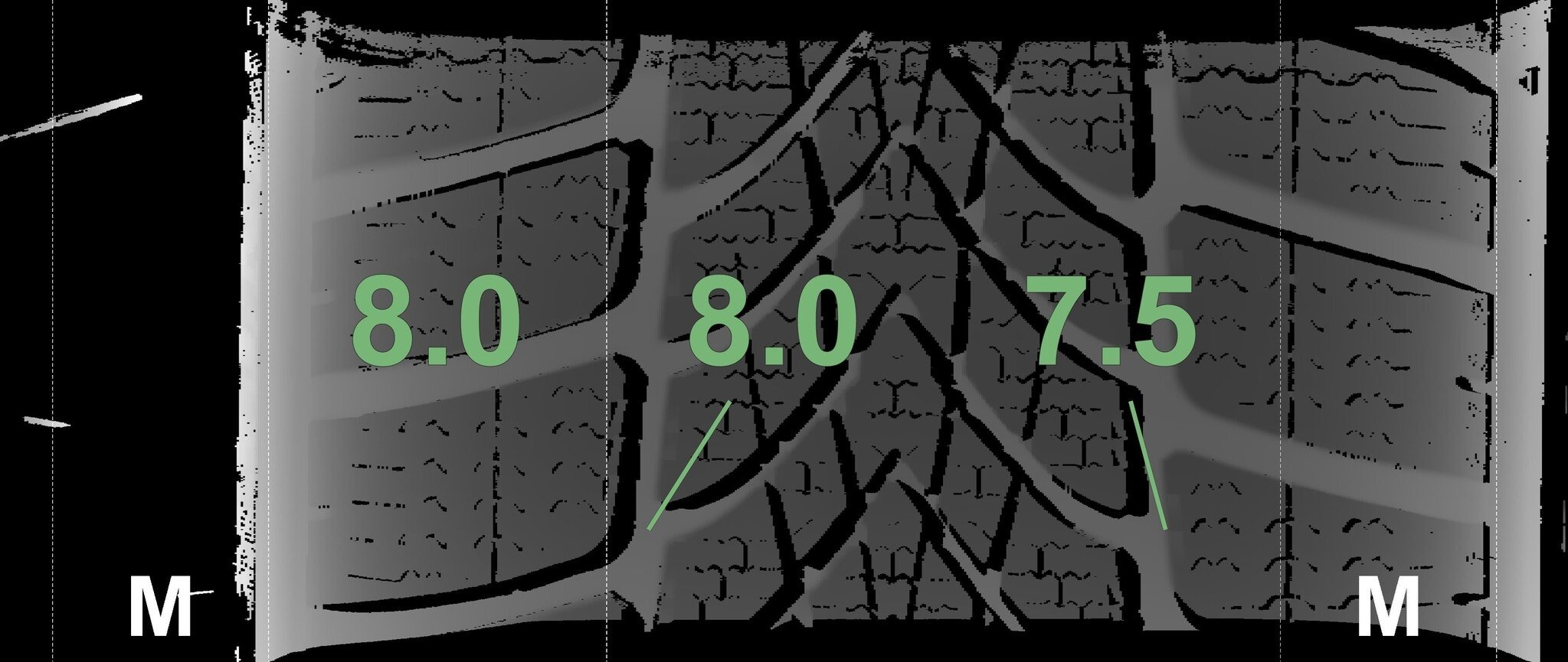 De gemeten profieldieptes en de details van de velgen zijn hierboven weergegeven.
