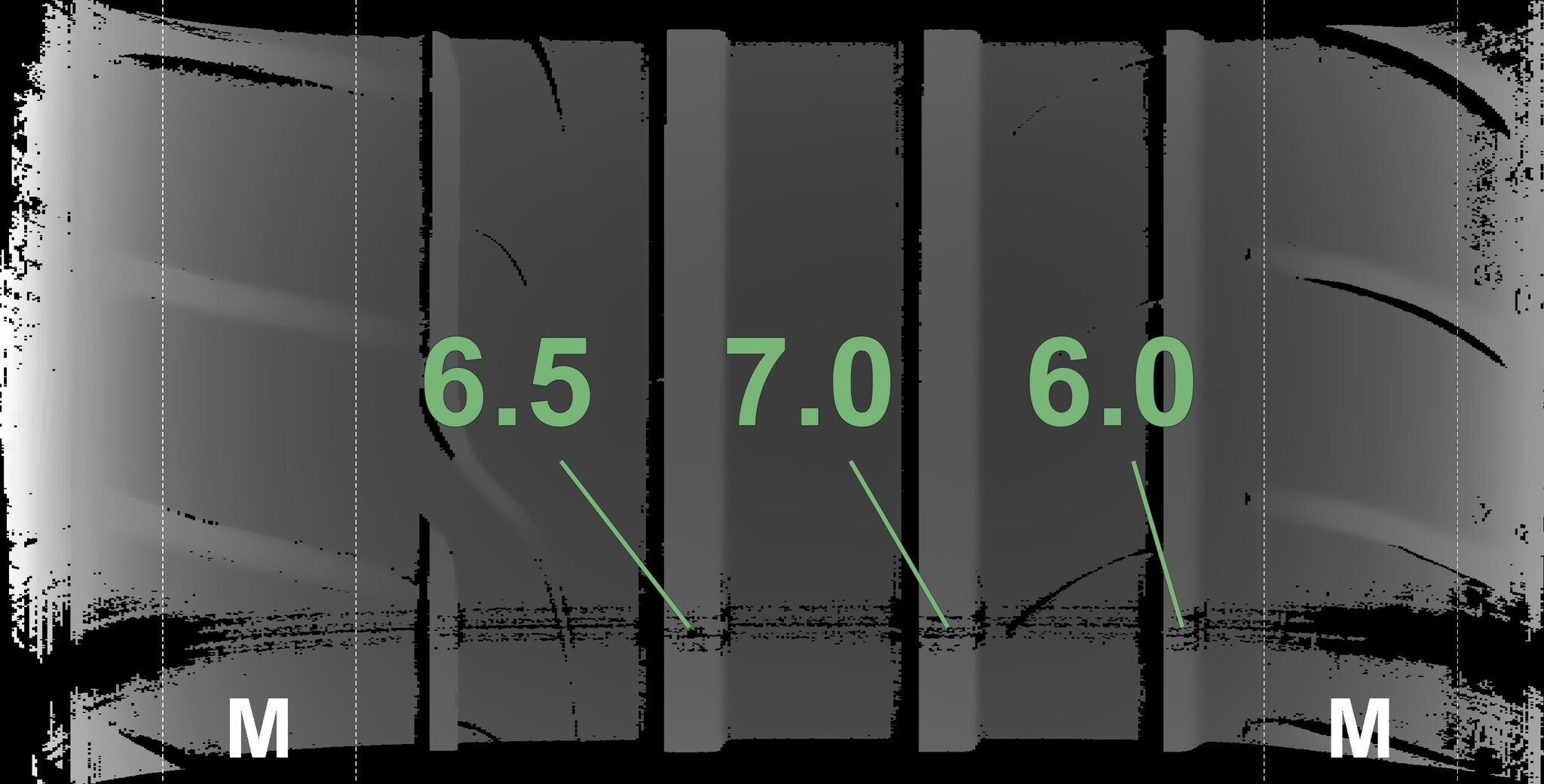 De gemeten profieldieptes en de details van de velgen zijn hierboven weergegeven.