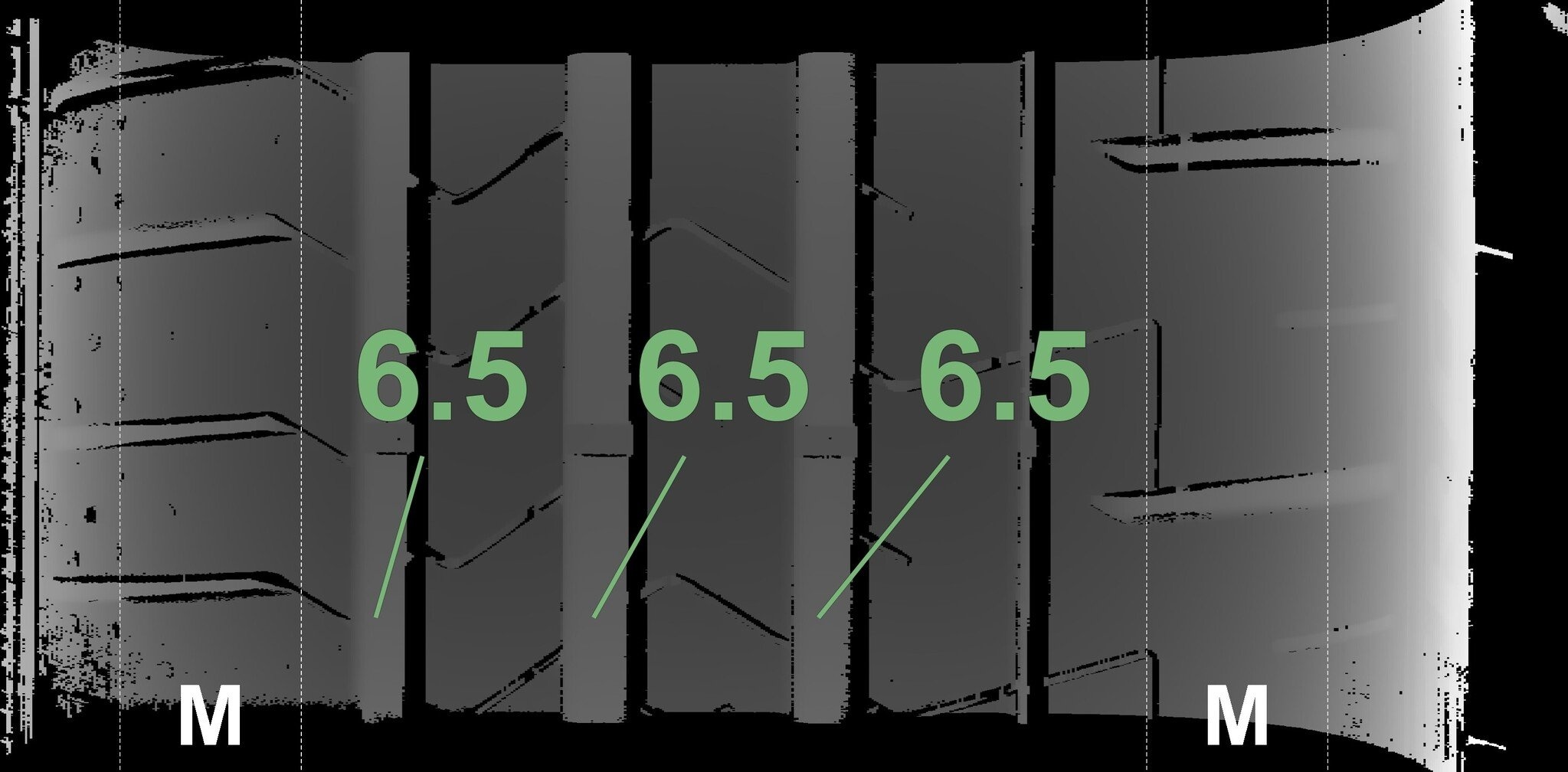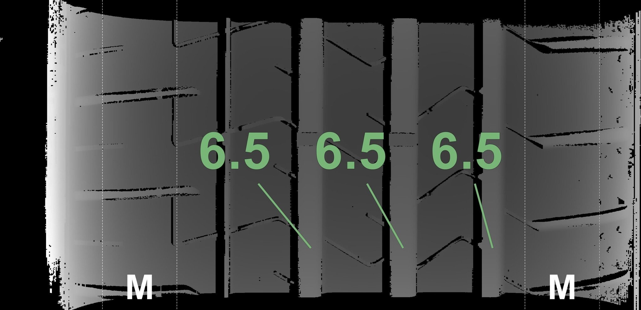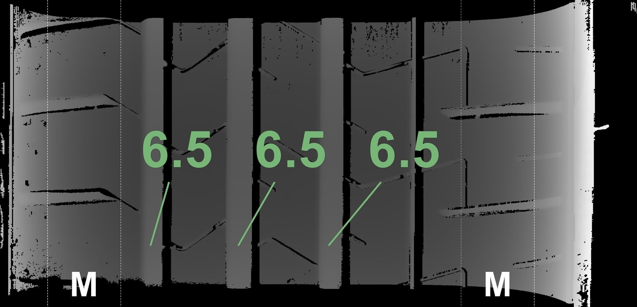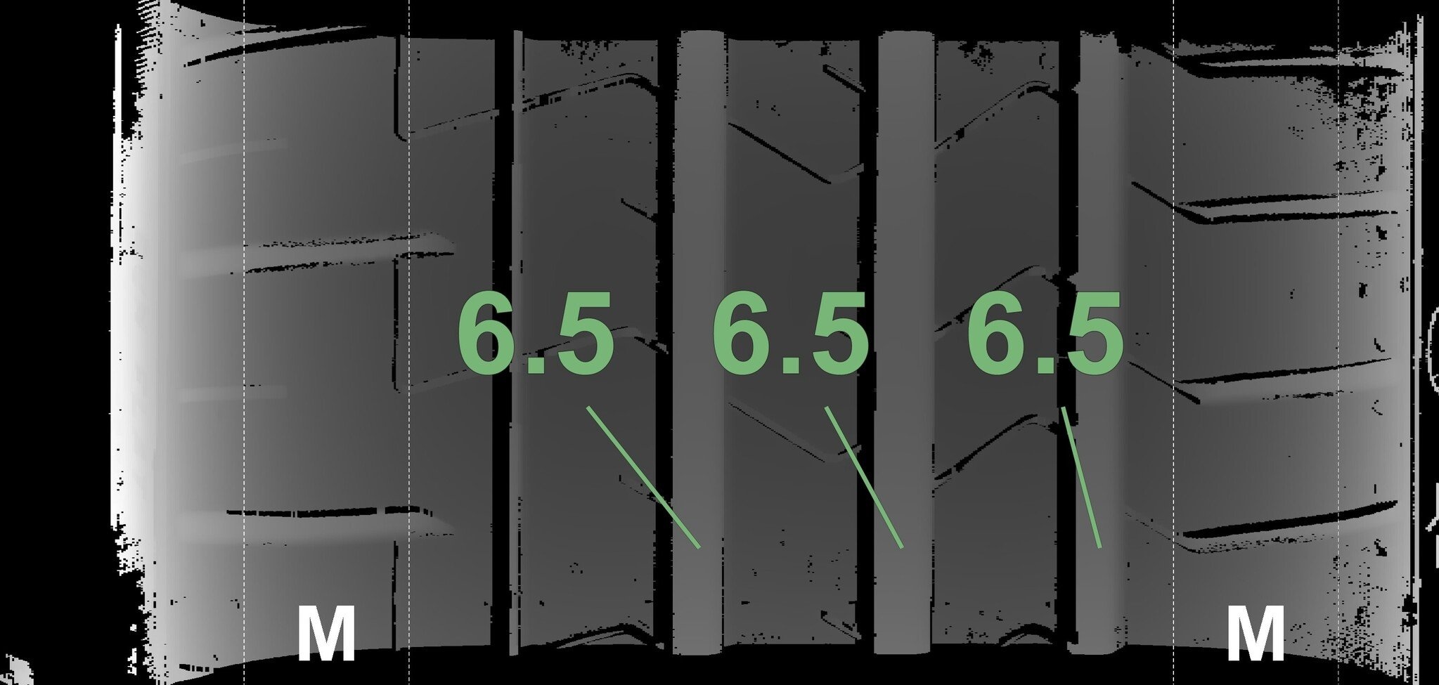 De gemeten profieldieptes en de details van de velgen zijn hierboven weergegeven.