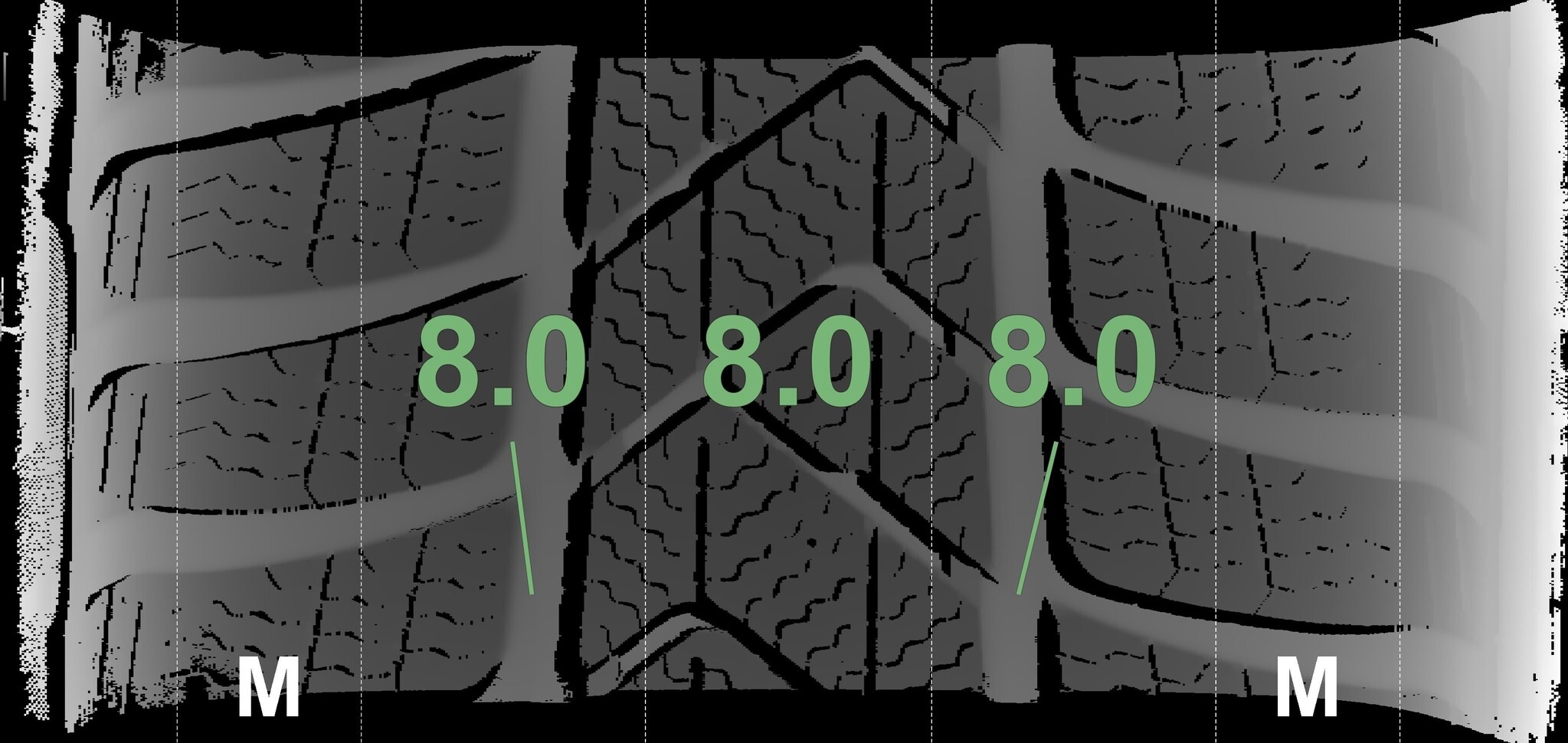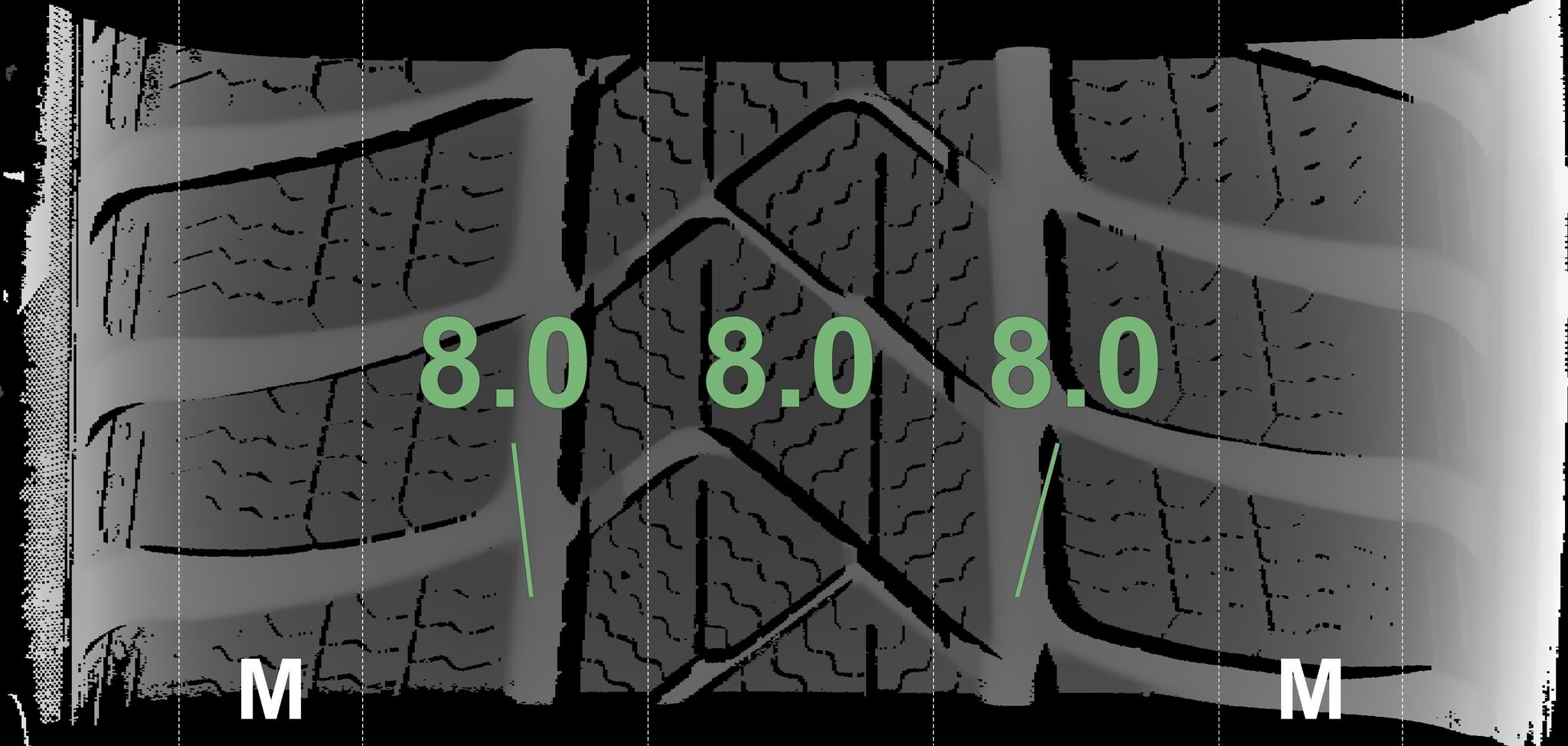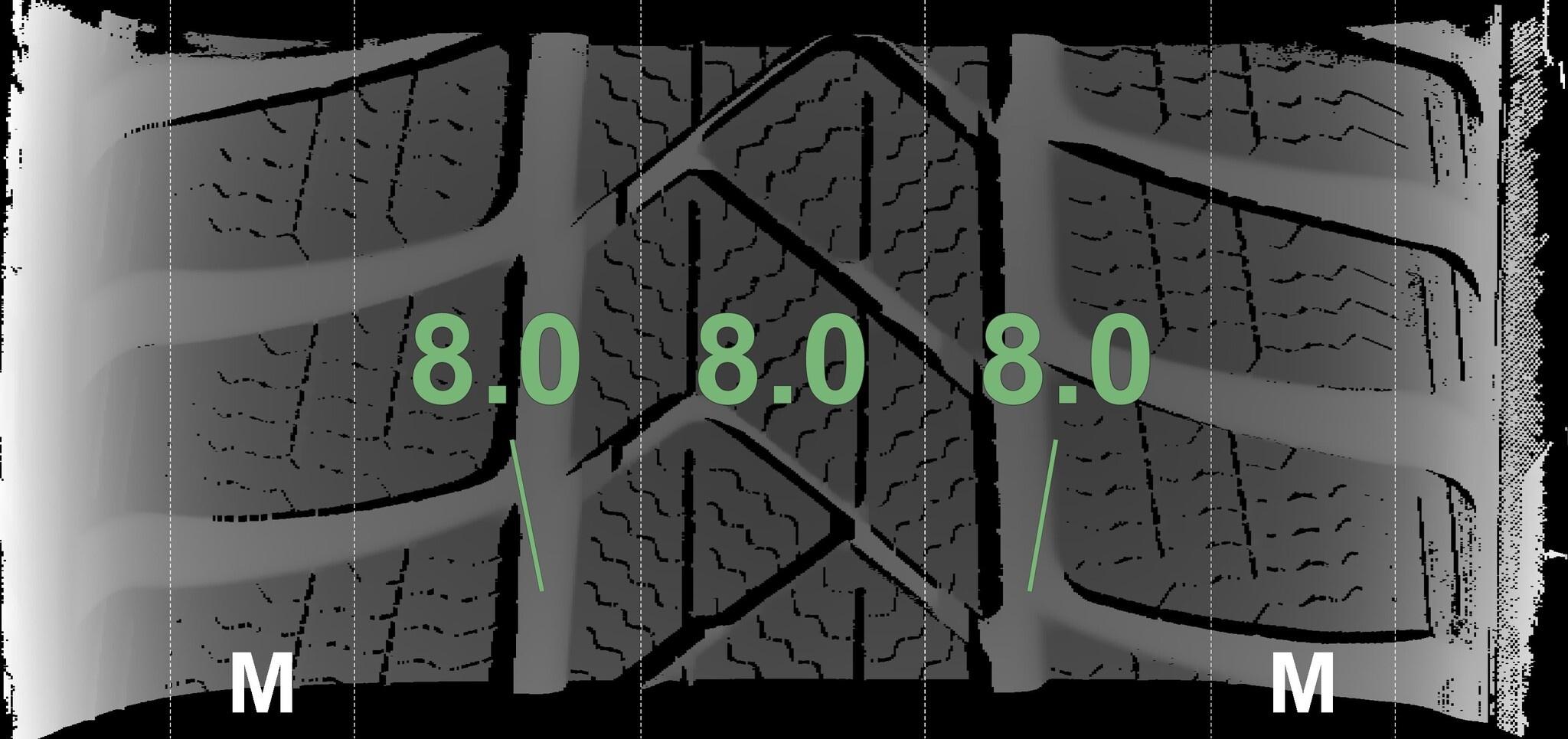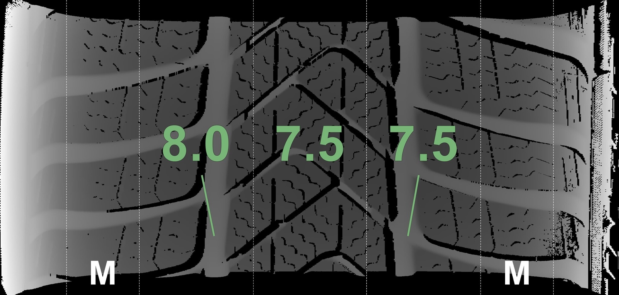 De gemeten profieldieptes en de details van de velgen zijn hierboven weergegeven.