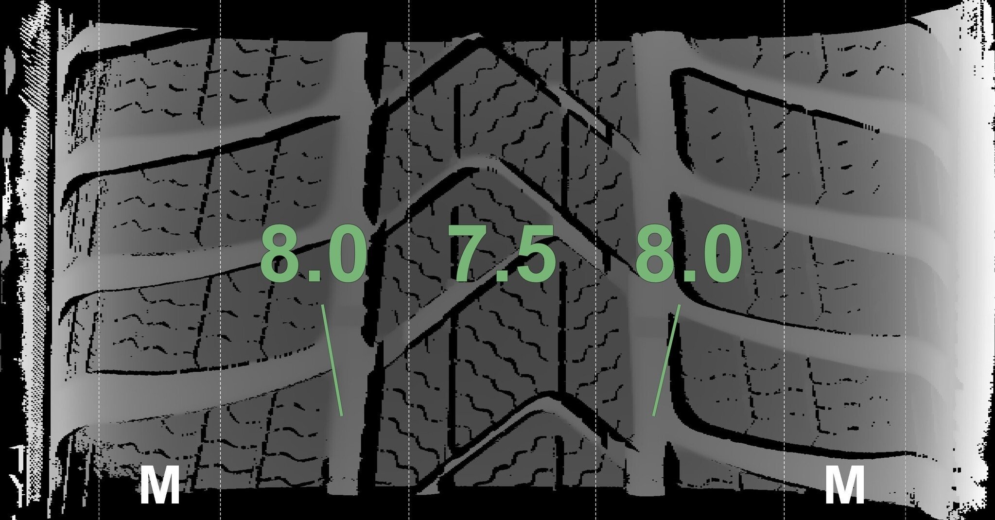 De gemeten profieldieptes en de details van de velgen zijn hierboven weergegeven.