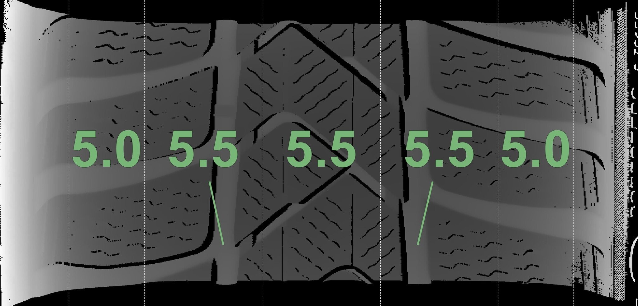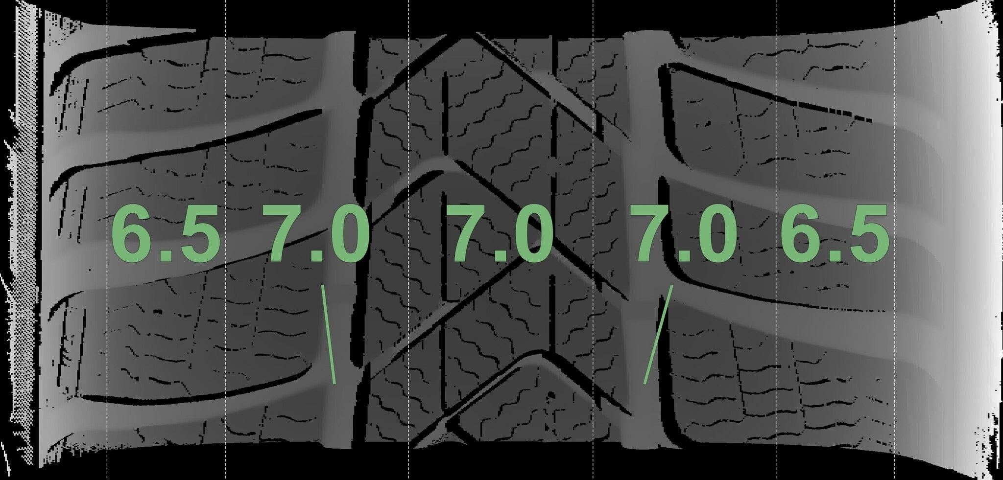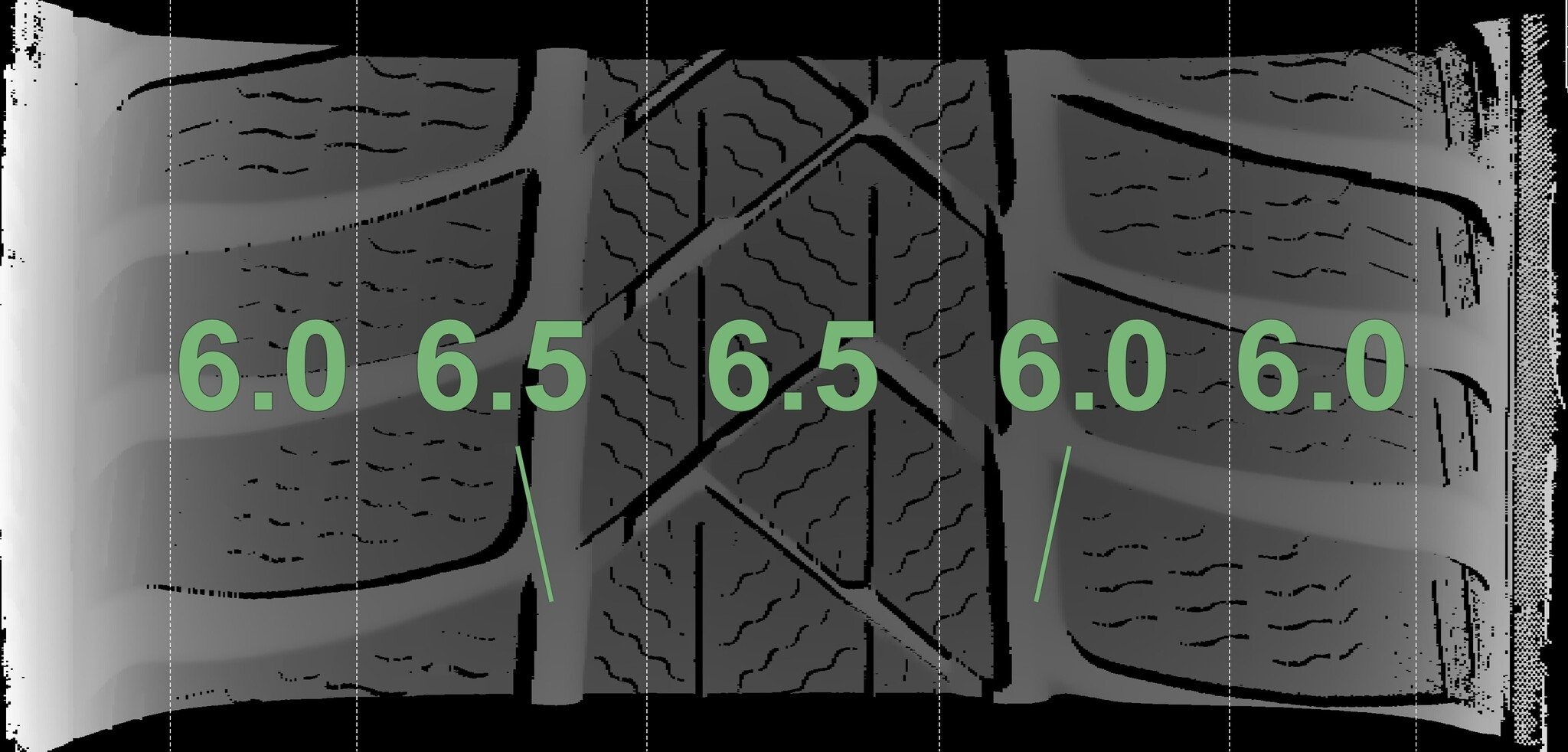 De gemeten profieldieptes en de details van de velgen zijn hierboven weergegeven.
