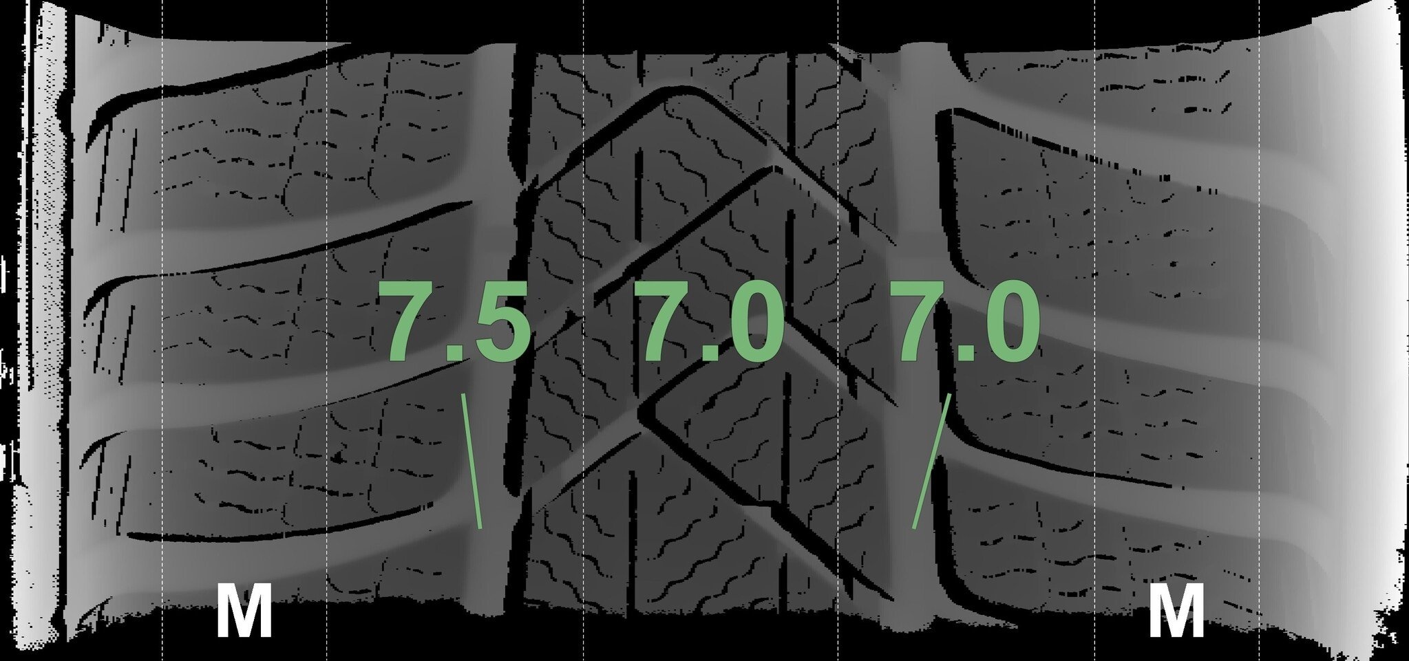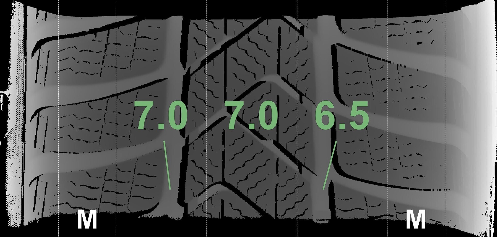 De gemeten profieldieptes en de details van de velgen zijn hierboven weergegeven.