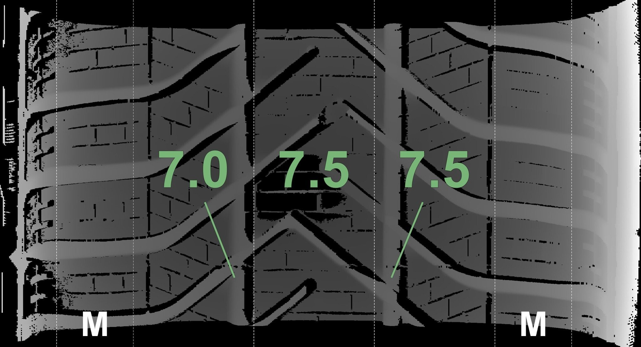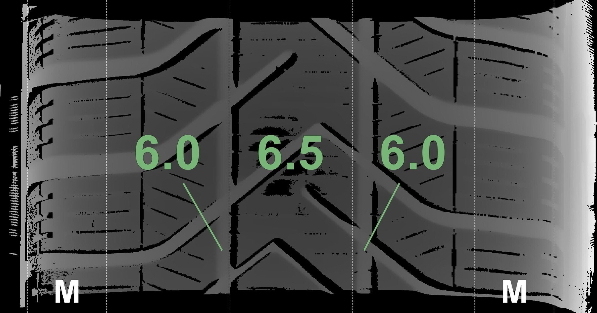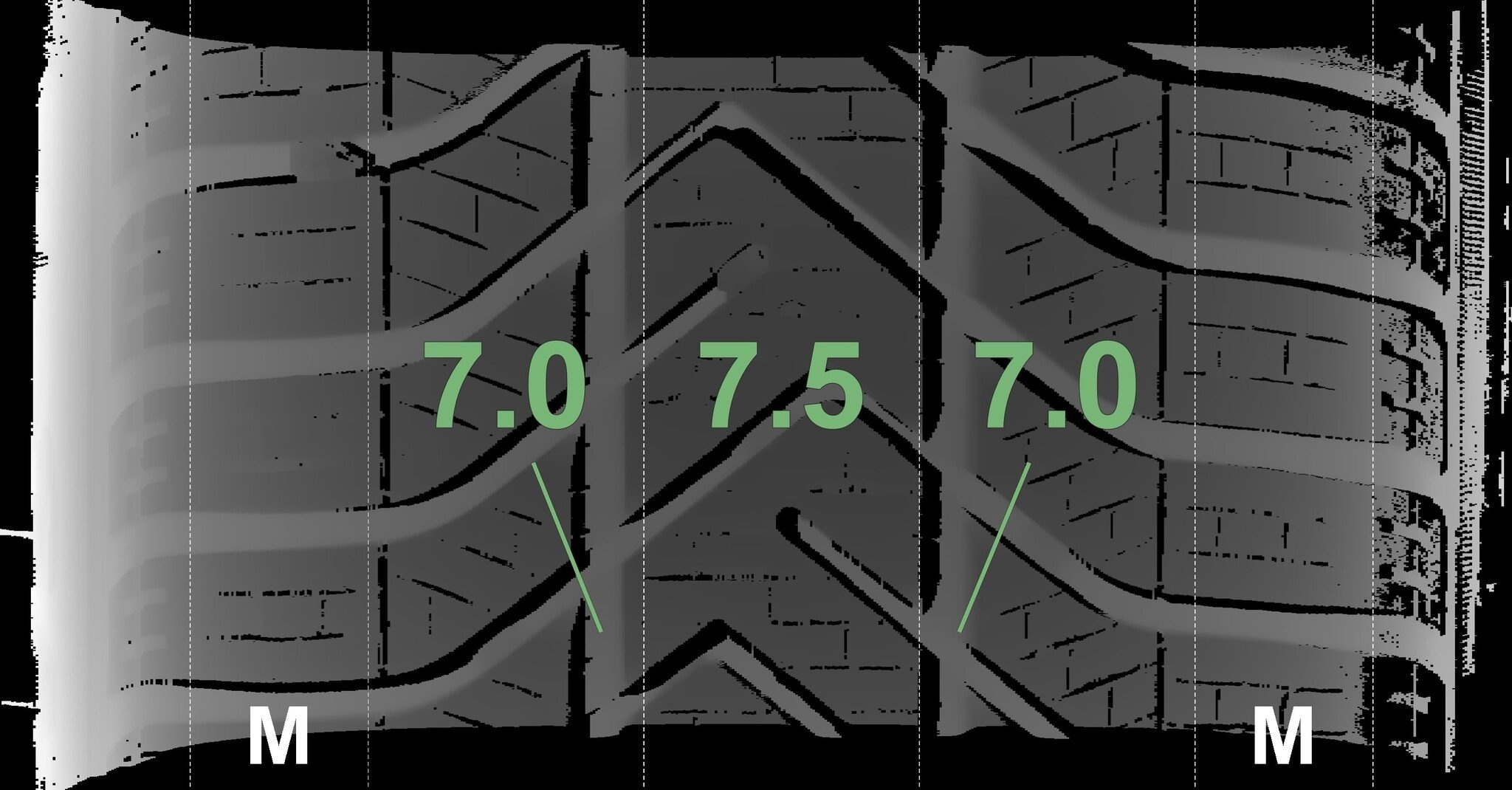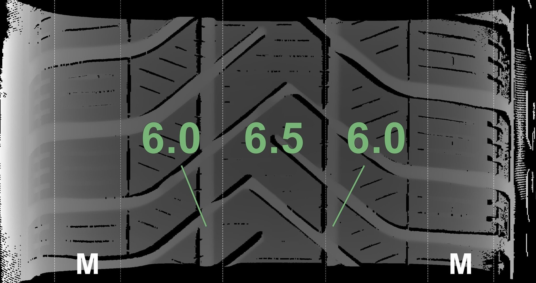 De gemeten profieldieptes en de details van de velgen zijn hierboven weergegeven.