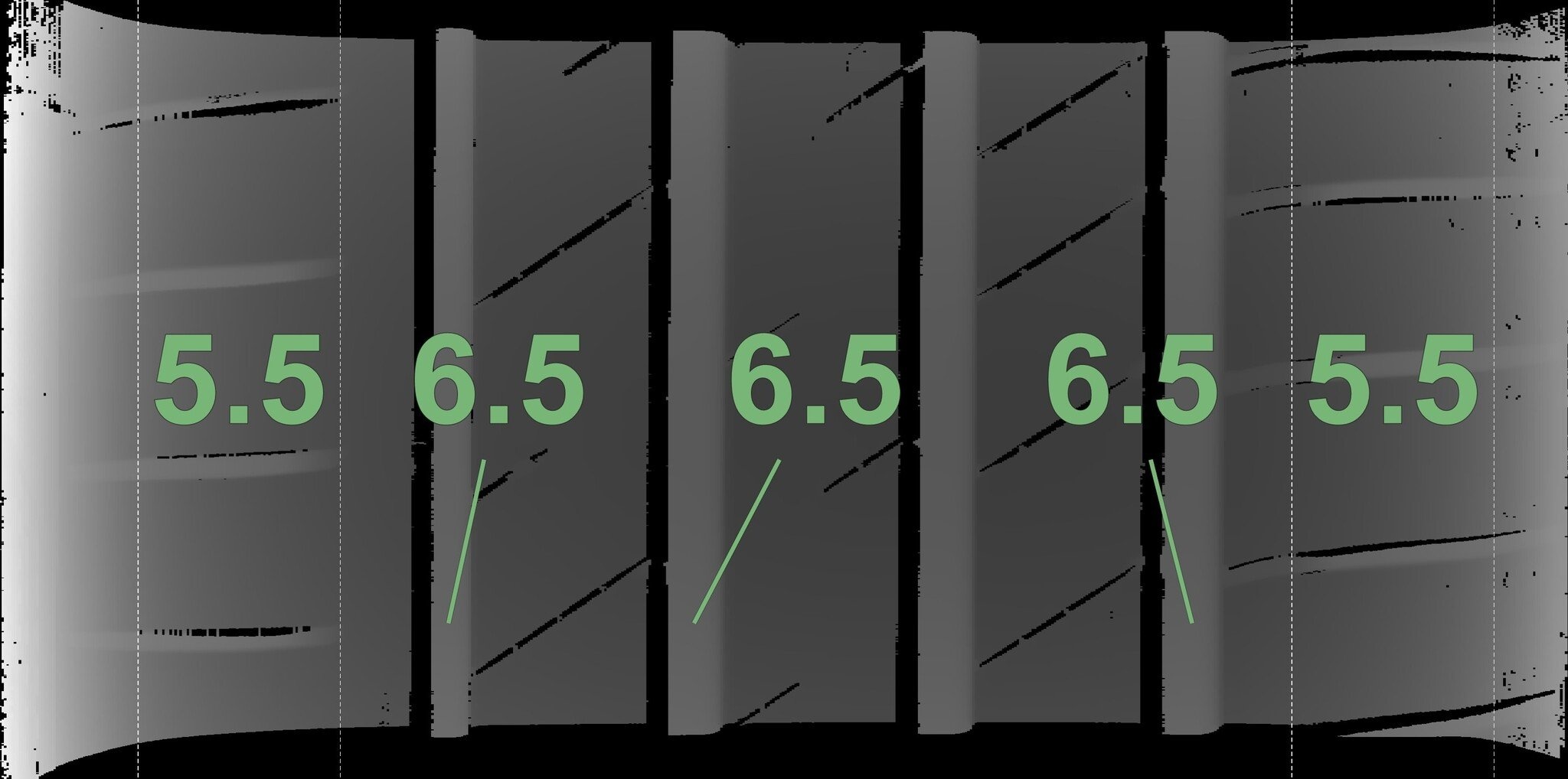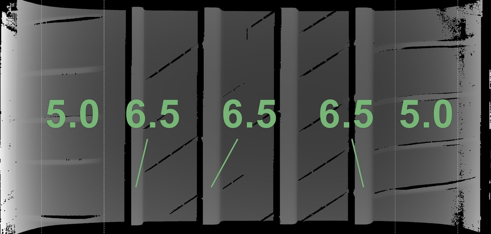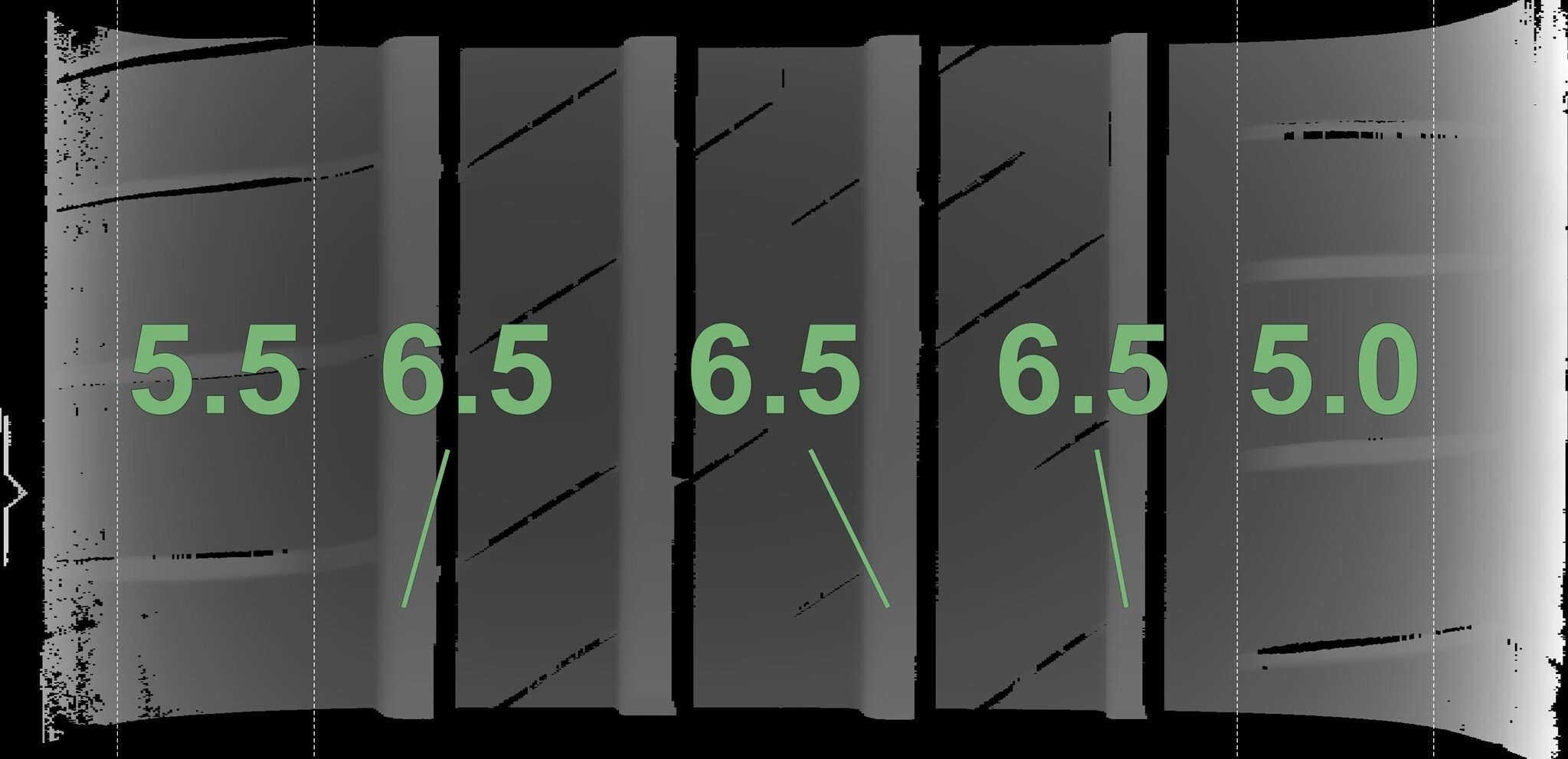 De gemeten profieldieptes en de details van de velgen zijn hierboven weergegeven.