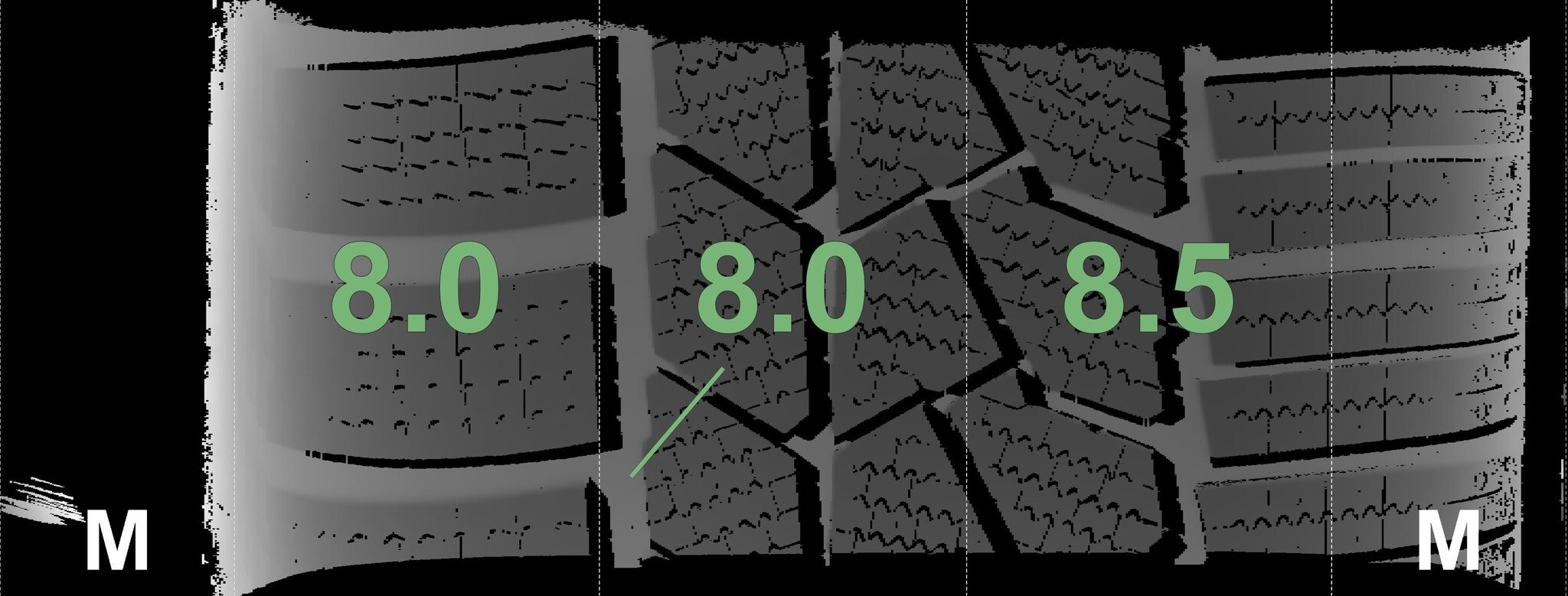 De gemeten profieldieptes en de details van de velgen zijn hierboven weergegeven.