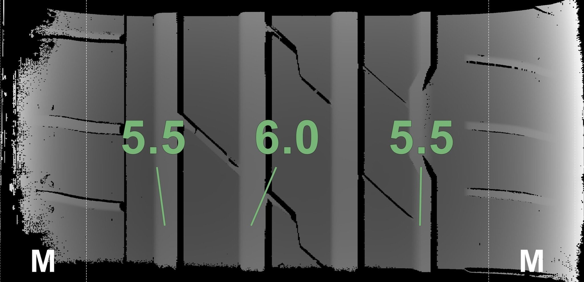 De gemeten profieldieptes en de details van de velgen zijn hierboven weergegeven.