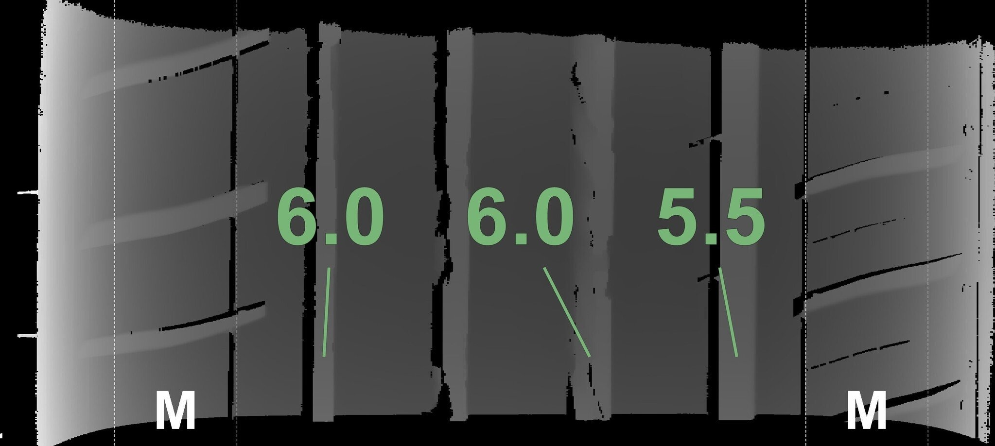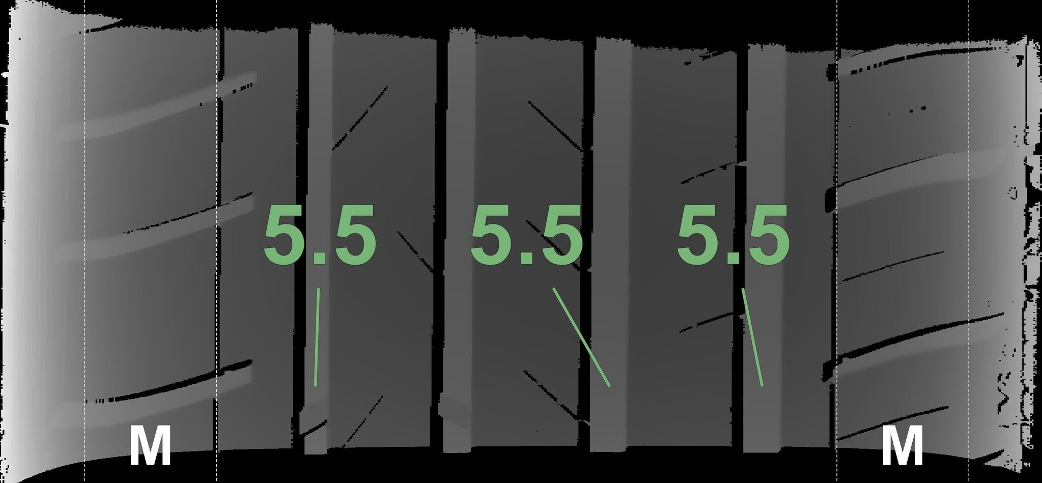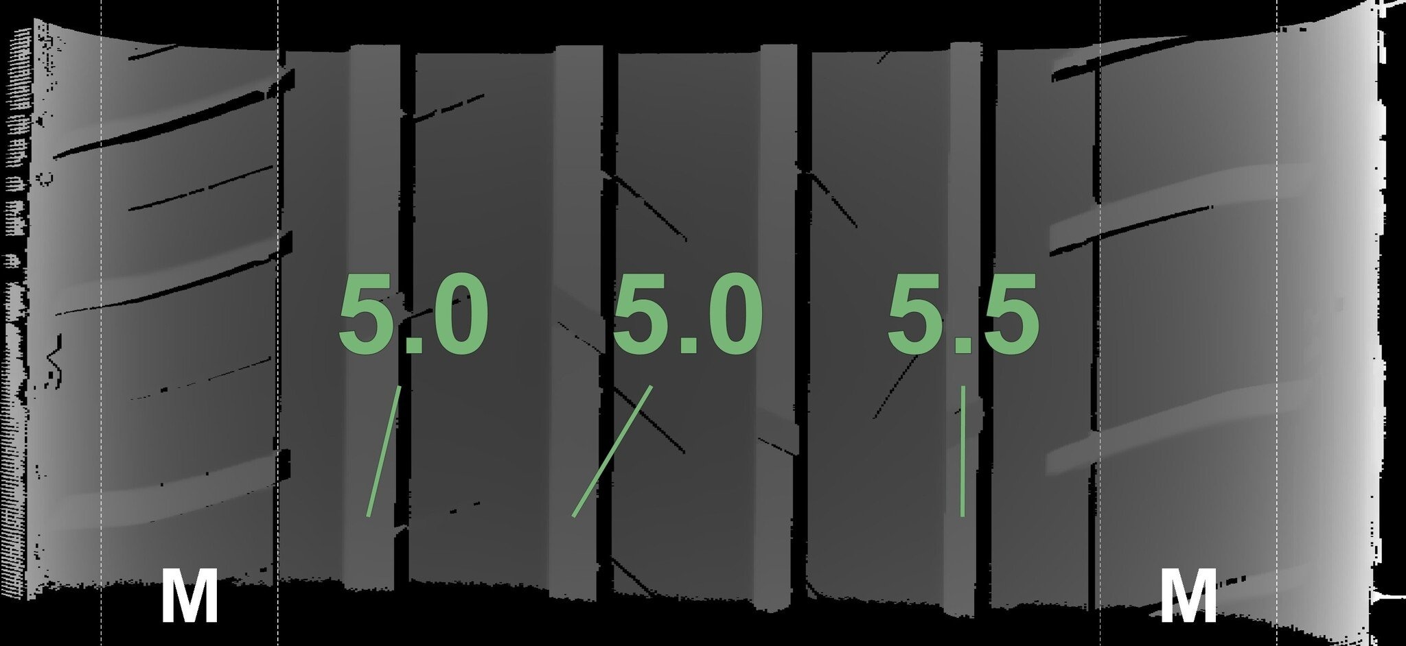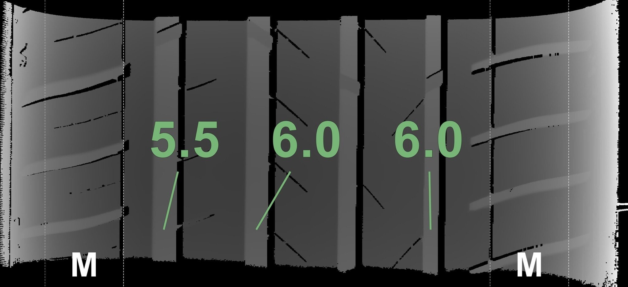 De gemeten profieldieptes en de details van de velgen zijn hierboven weergegeven.