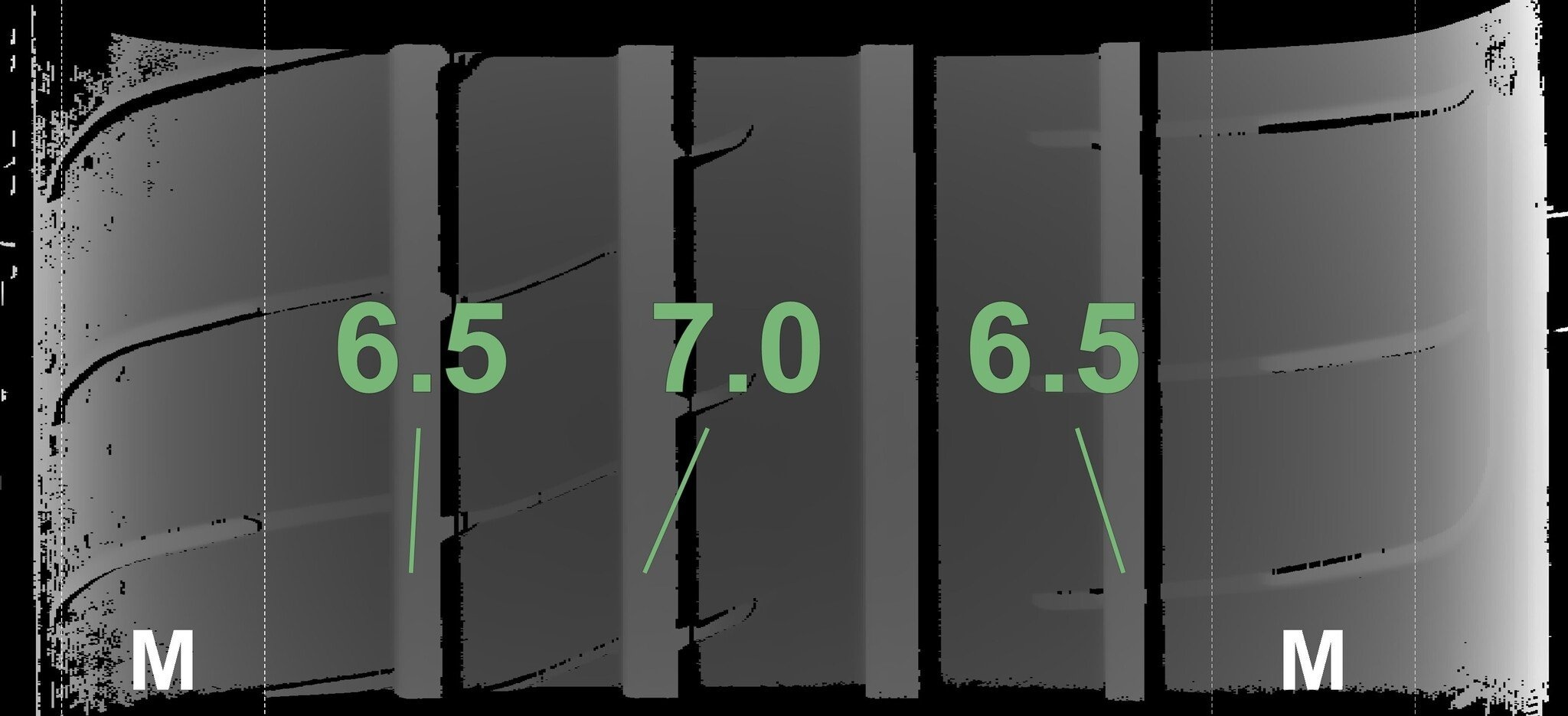 De gemeten profieldieptes en de details van de velgen zijn hierboven weergegeven.