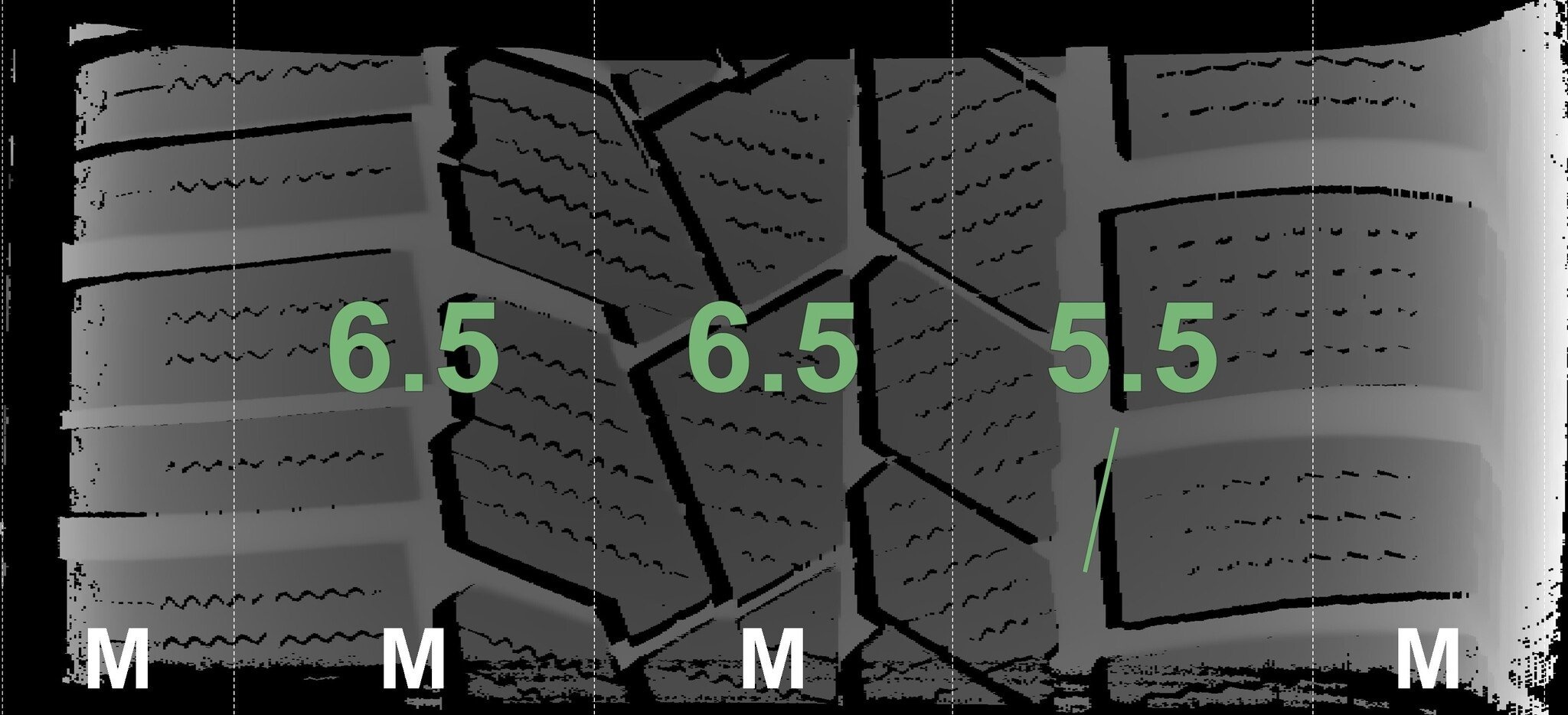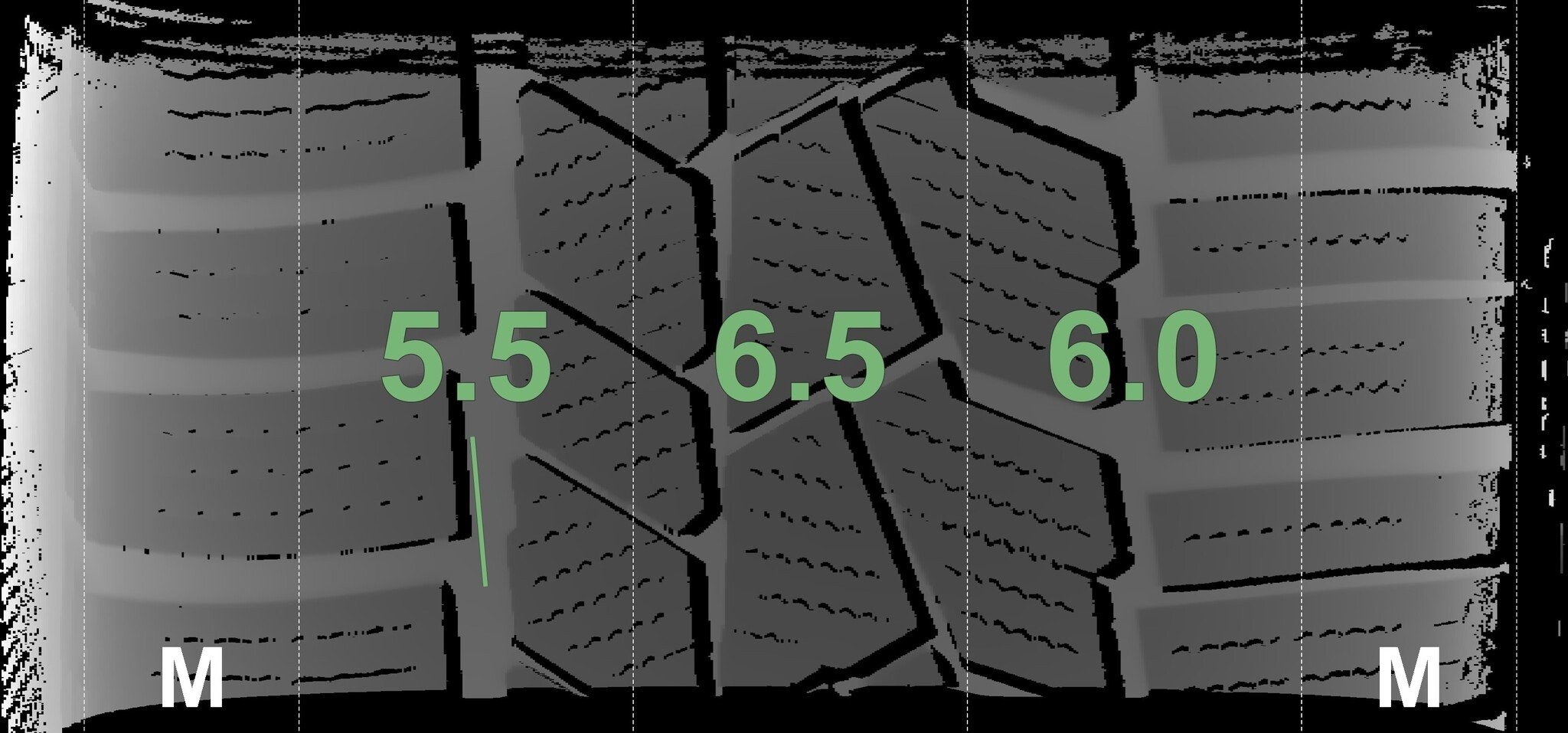 De gemeten profieldieptes en de details van de velgen zijn hierboven weergegeven.