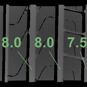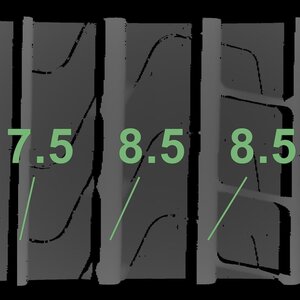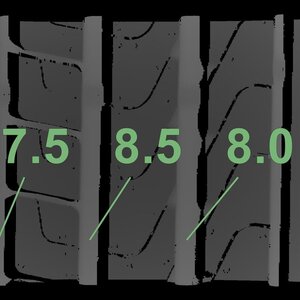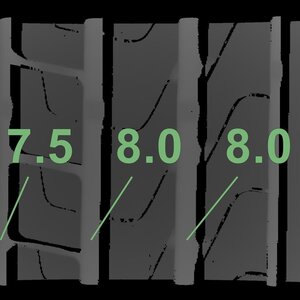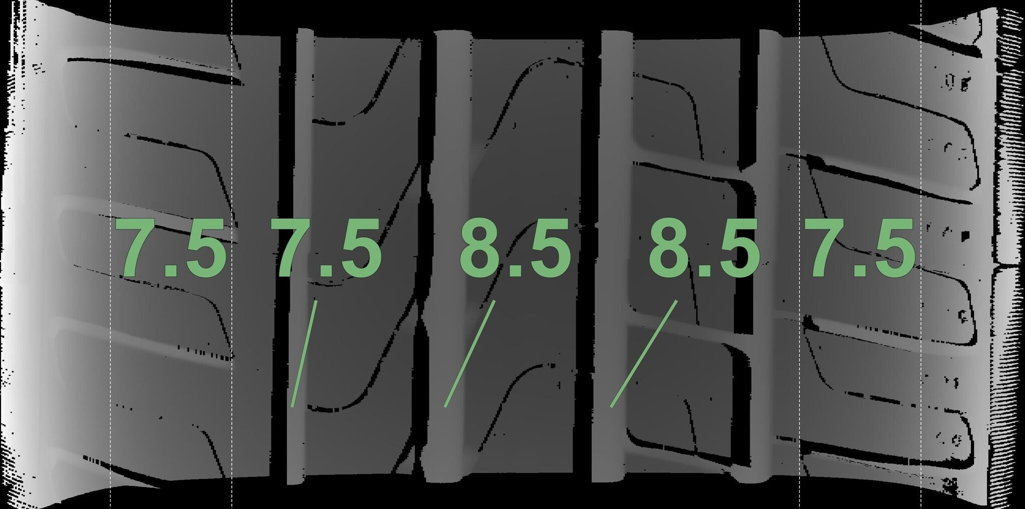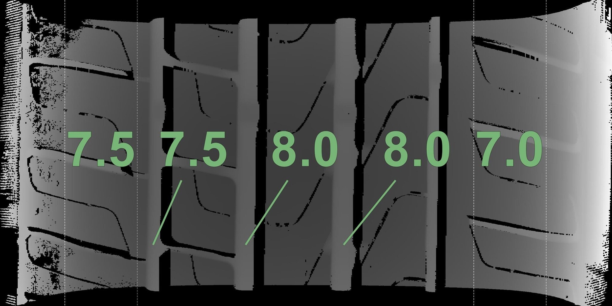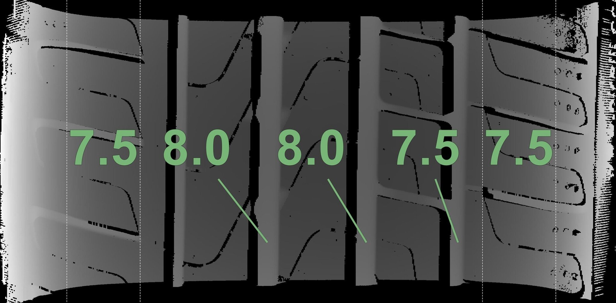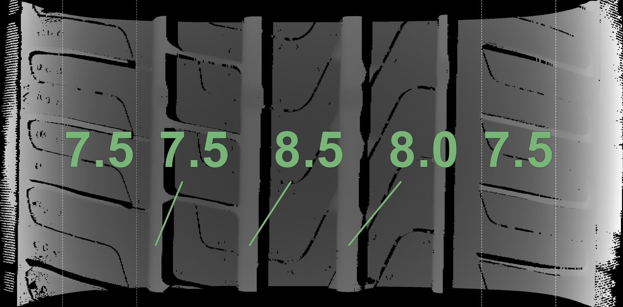 De gemeten profieldieptes en de details van de velgen zijn hierboven weergegeven.