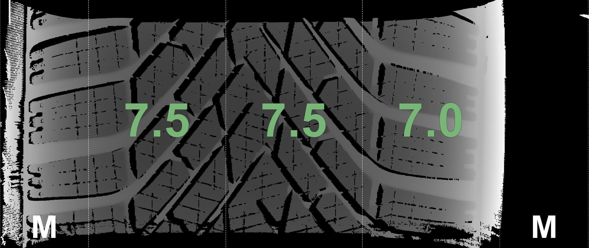 De gemeten profieldieptes en de details van de velgen zijn hierboven weergegeven.