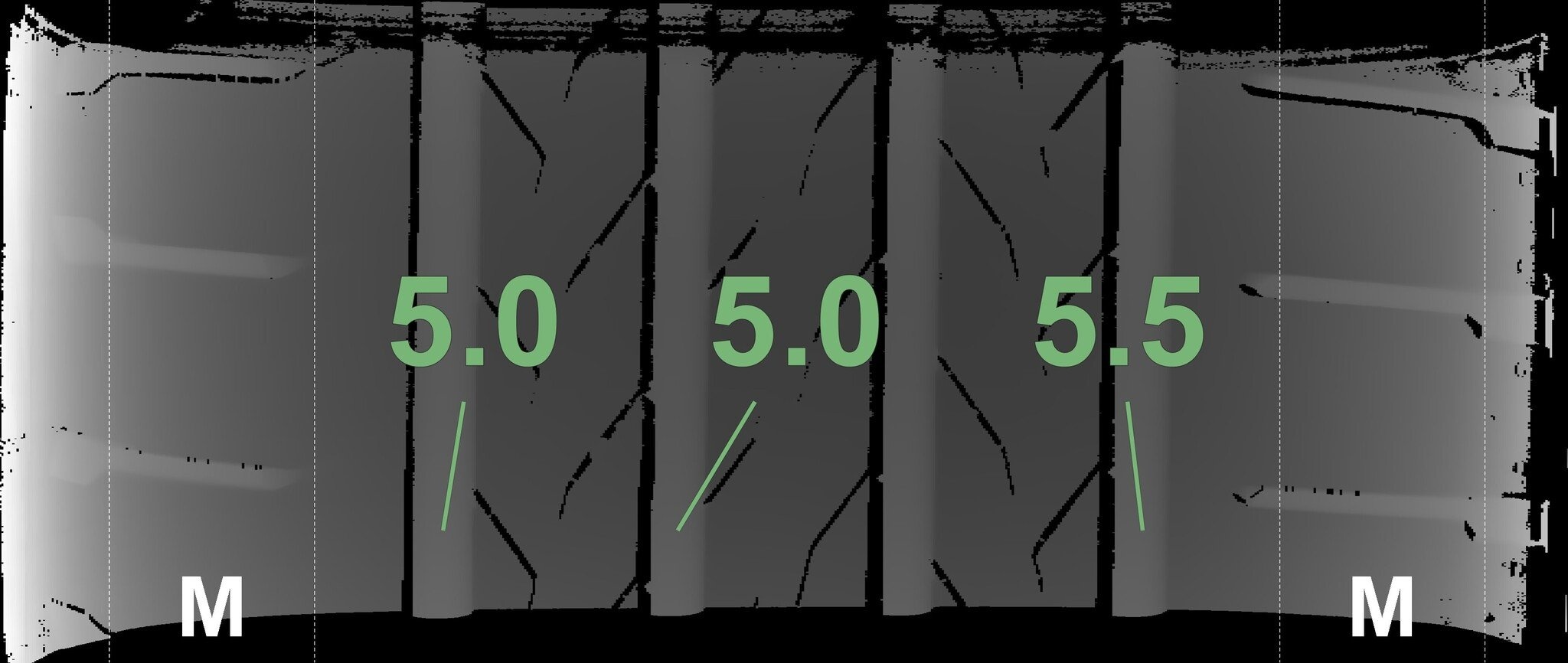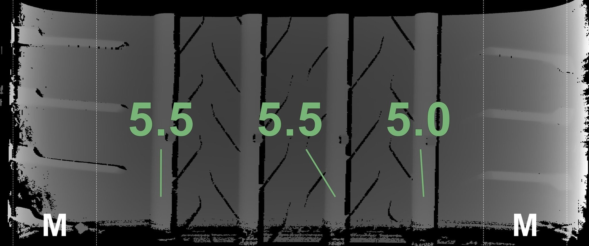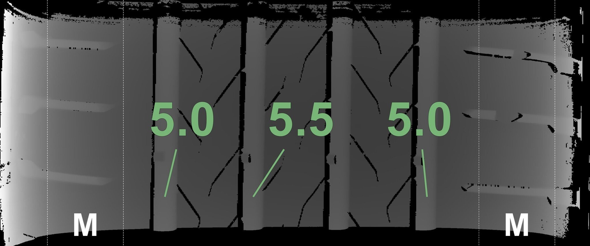 De gemeten profieldieptes en de details van de velgen zijn hierboven weergegeven.