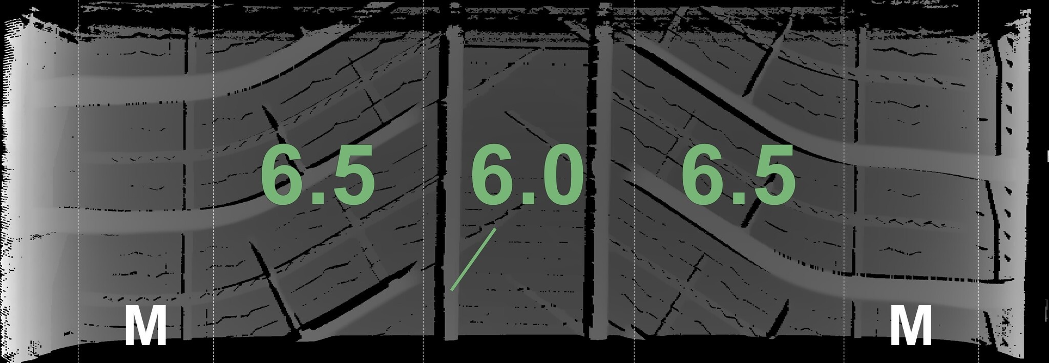 De gemeten profieldieptes en de details van de velgen zijn hierboven weergegeven.