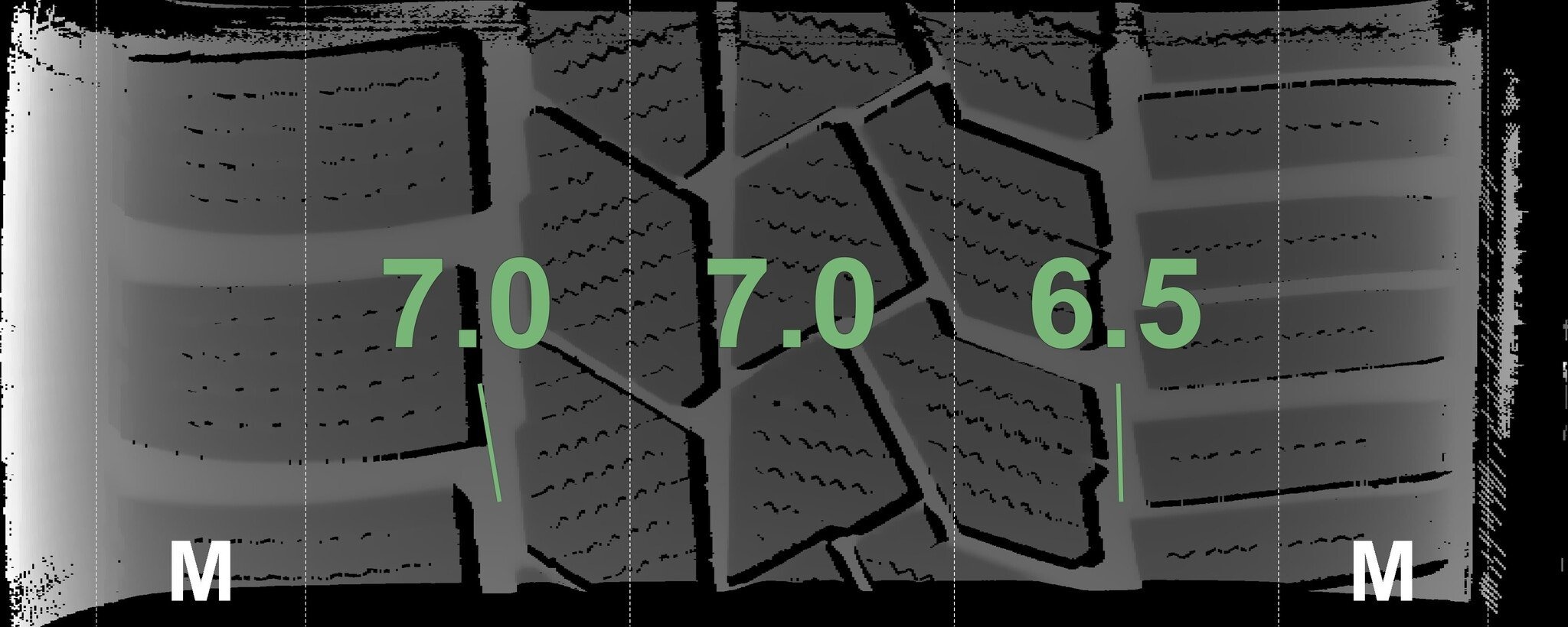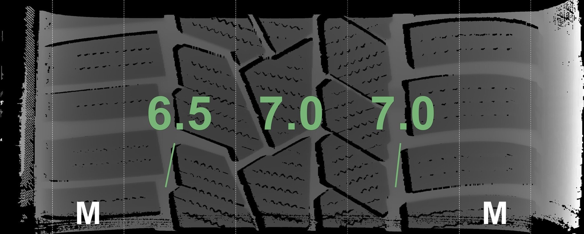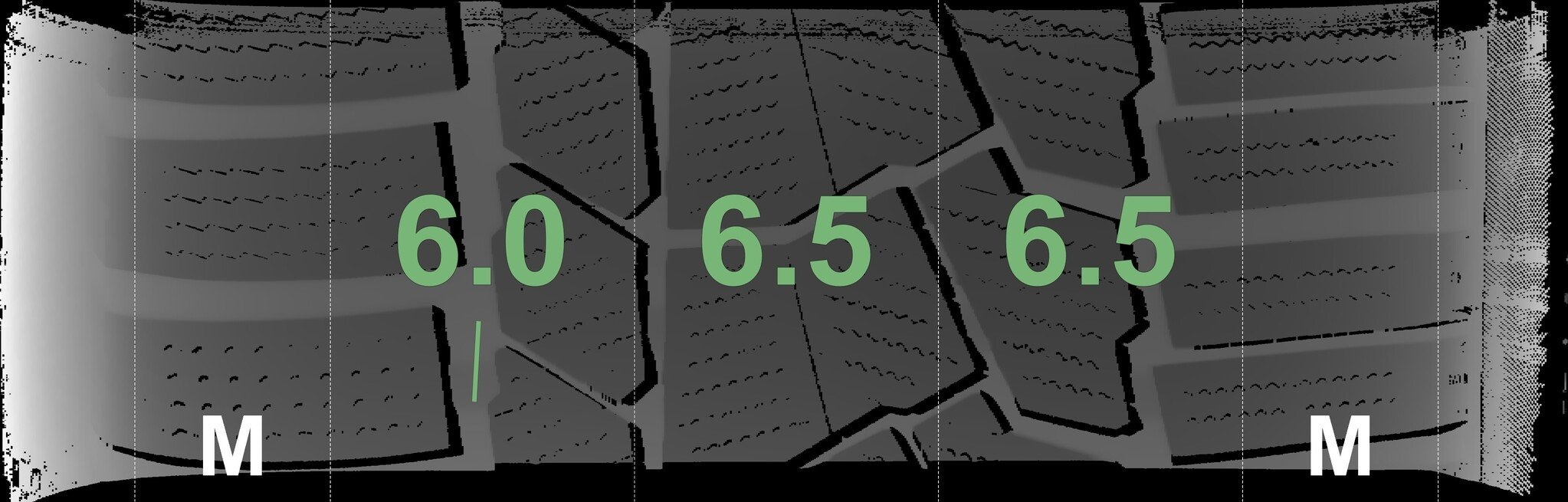De gemeten profieldieptes en de details van de velgen zijn hierboven weergegeven.