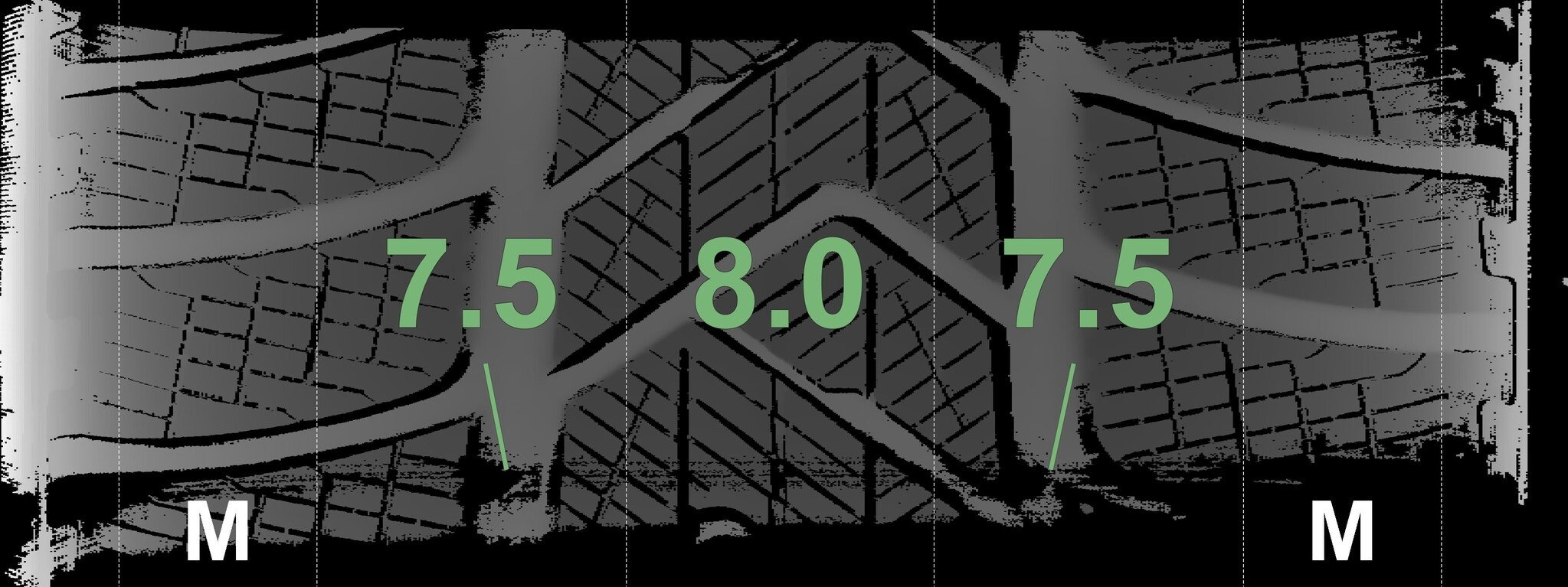De gemeten profieldieptes en de details van de velgen zijn hierboven weergegeven.