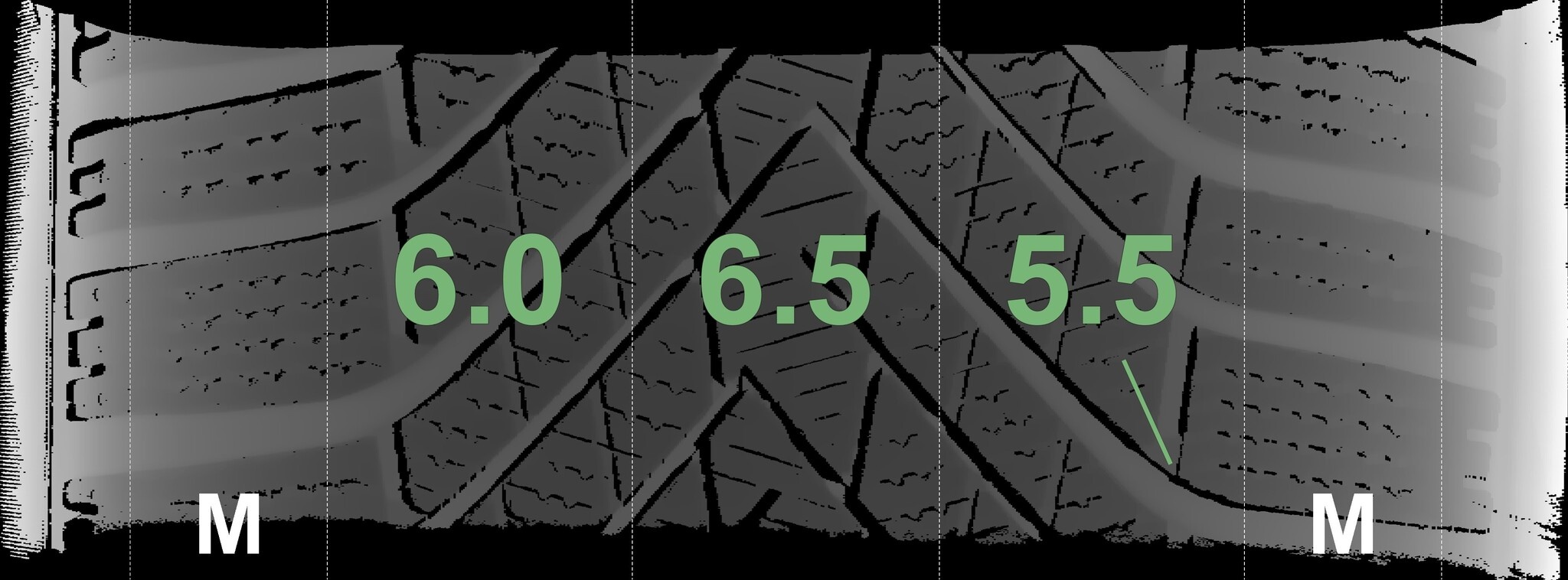 De gemeten profieldieptes en de details van de velgen zijn hierboven weergegeven.