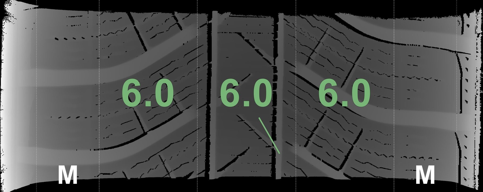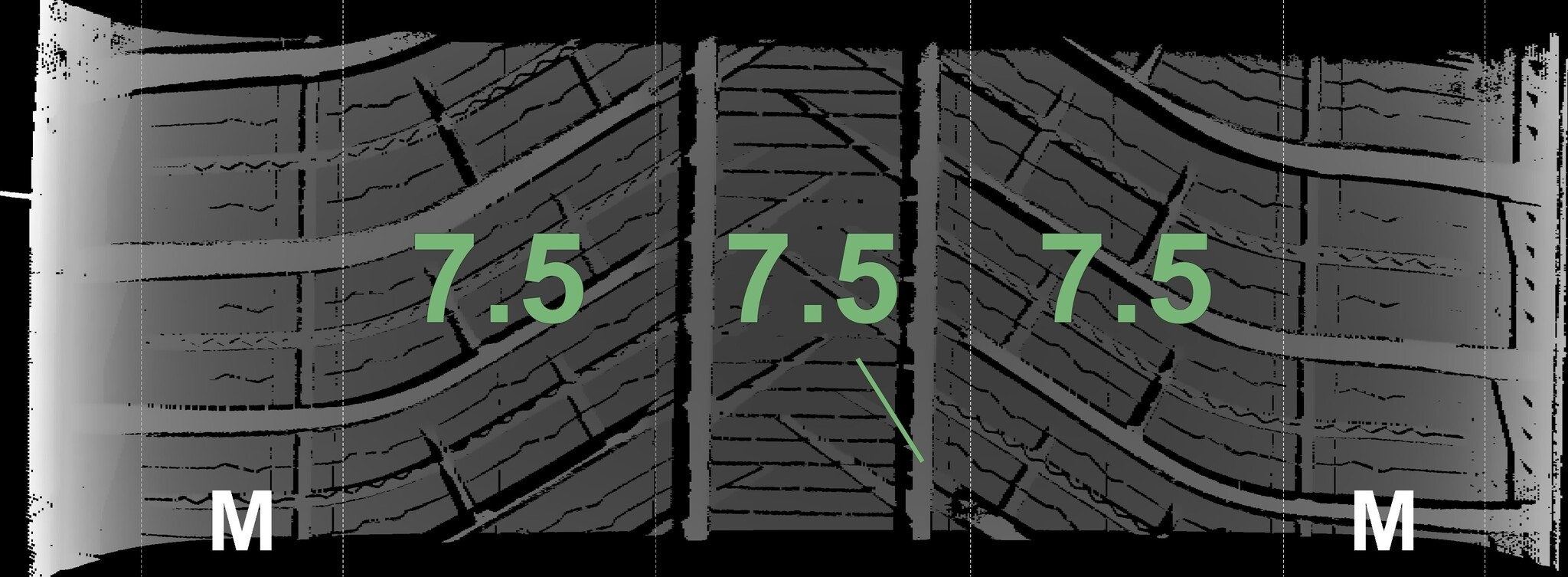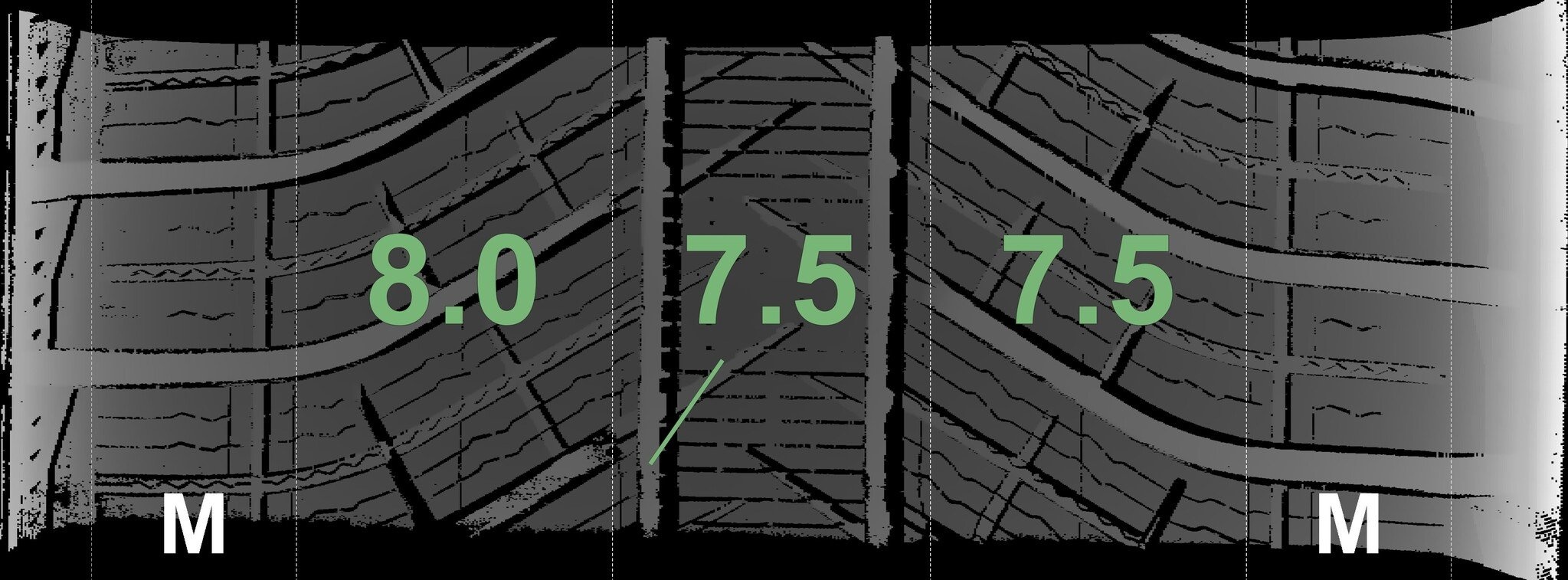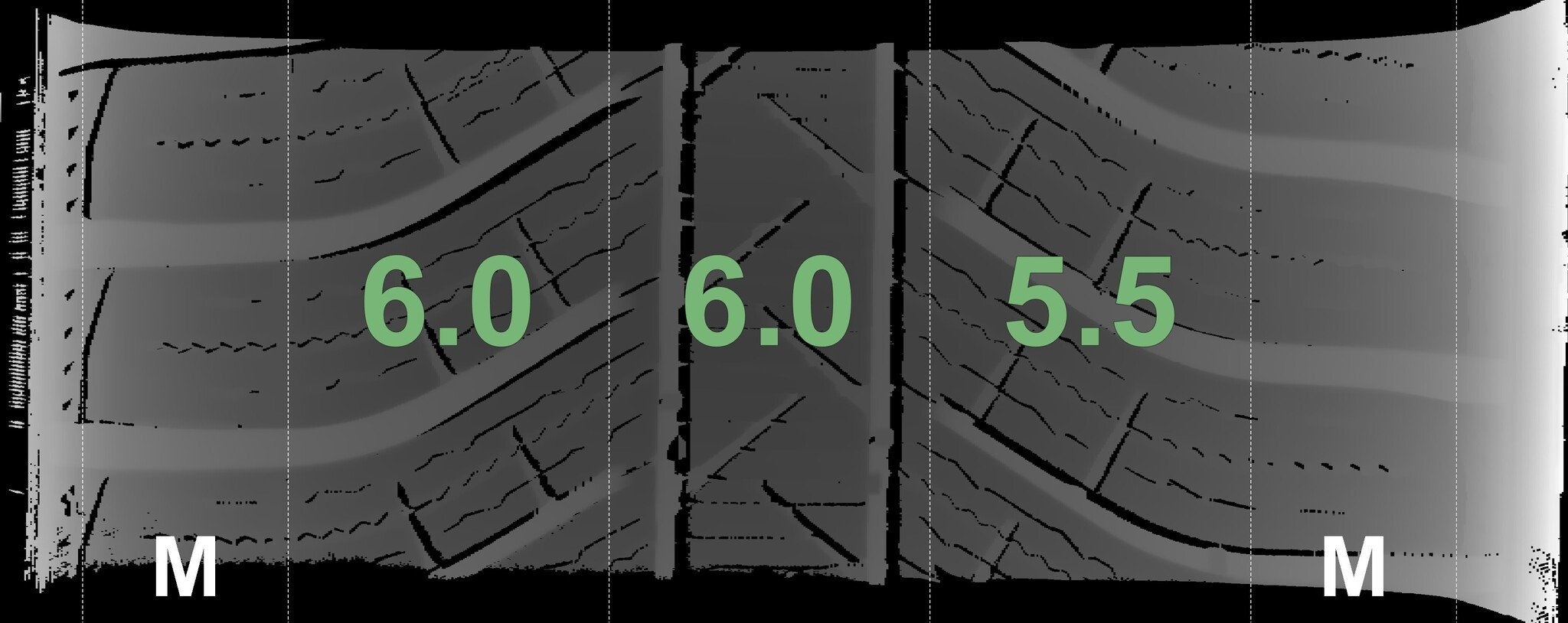 De gemeten profieldieptes en de details van de velgen zijn hierboven weergegeven.