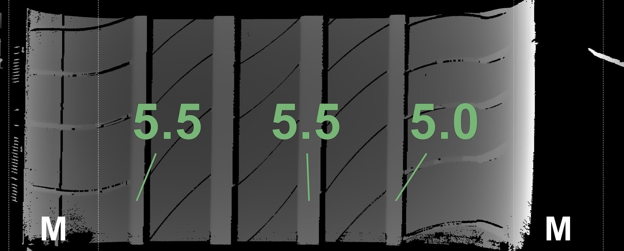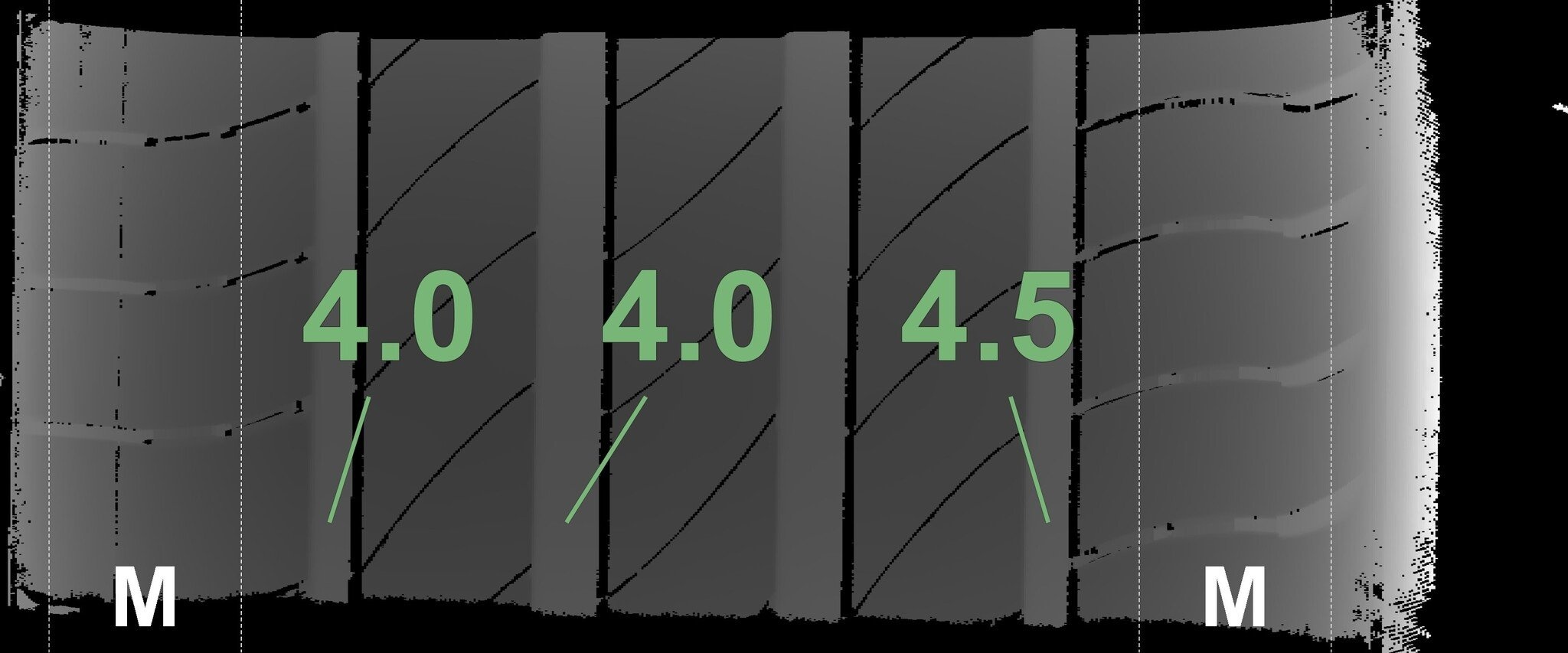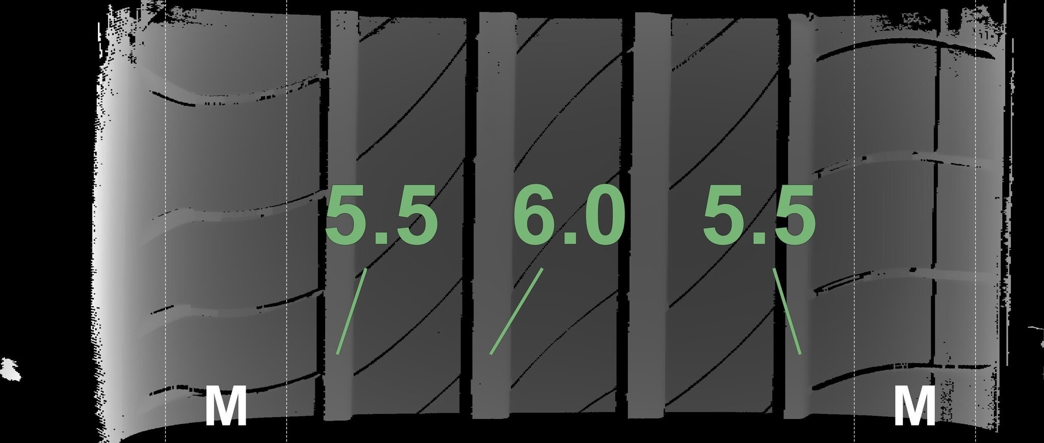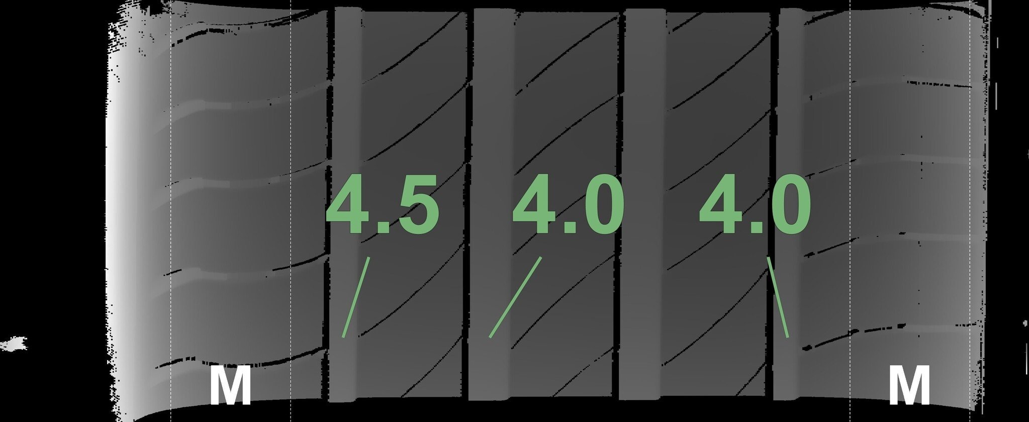 De gemeten profieldieptes en de details van de velgen zijn hierboven weergegeven.