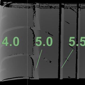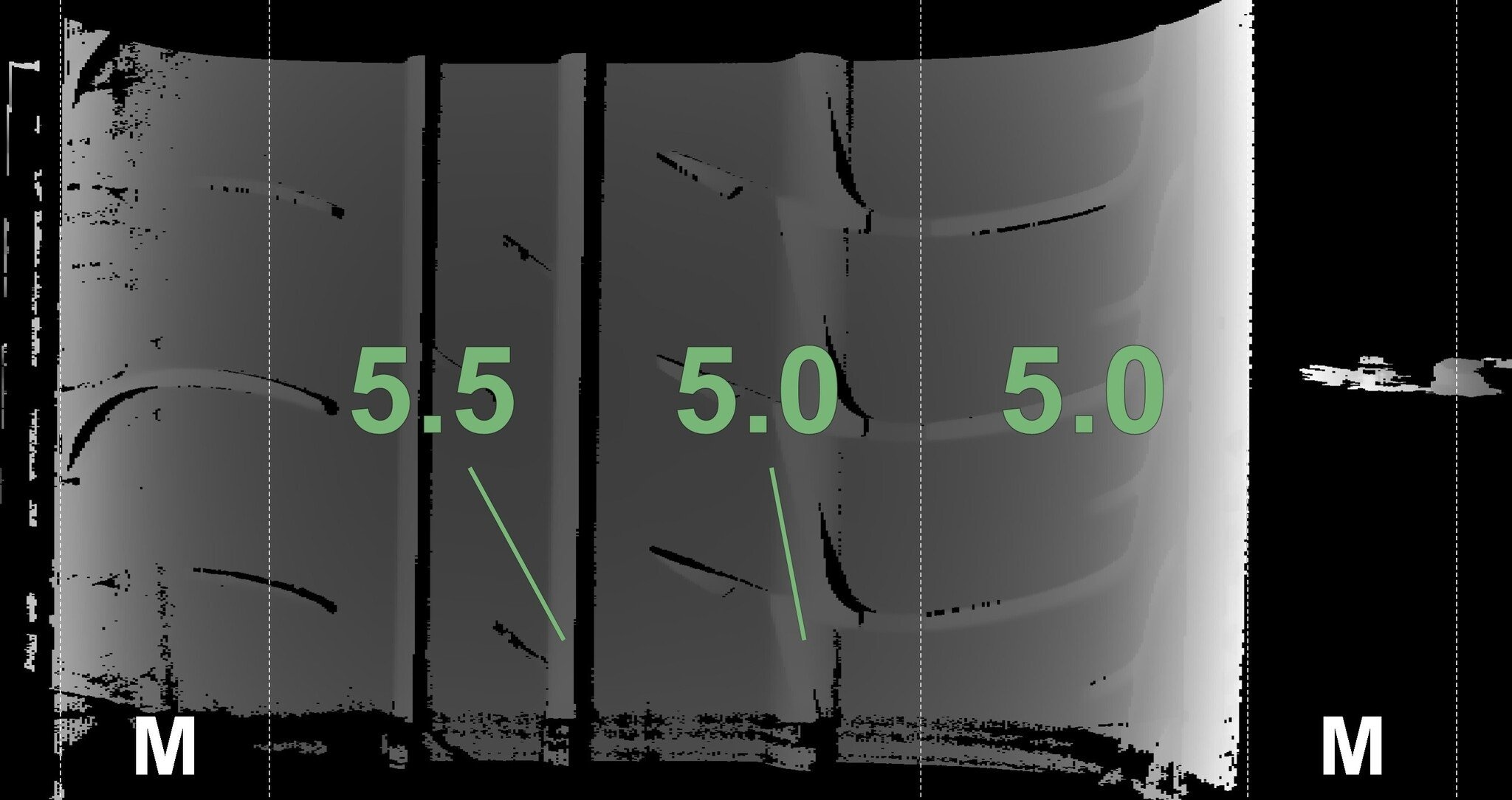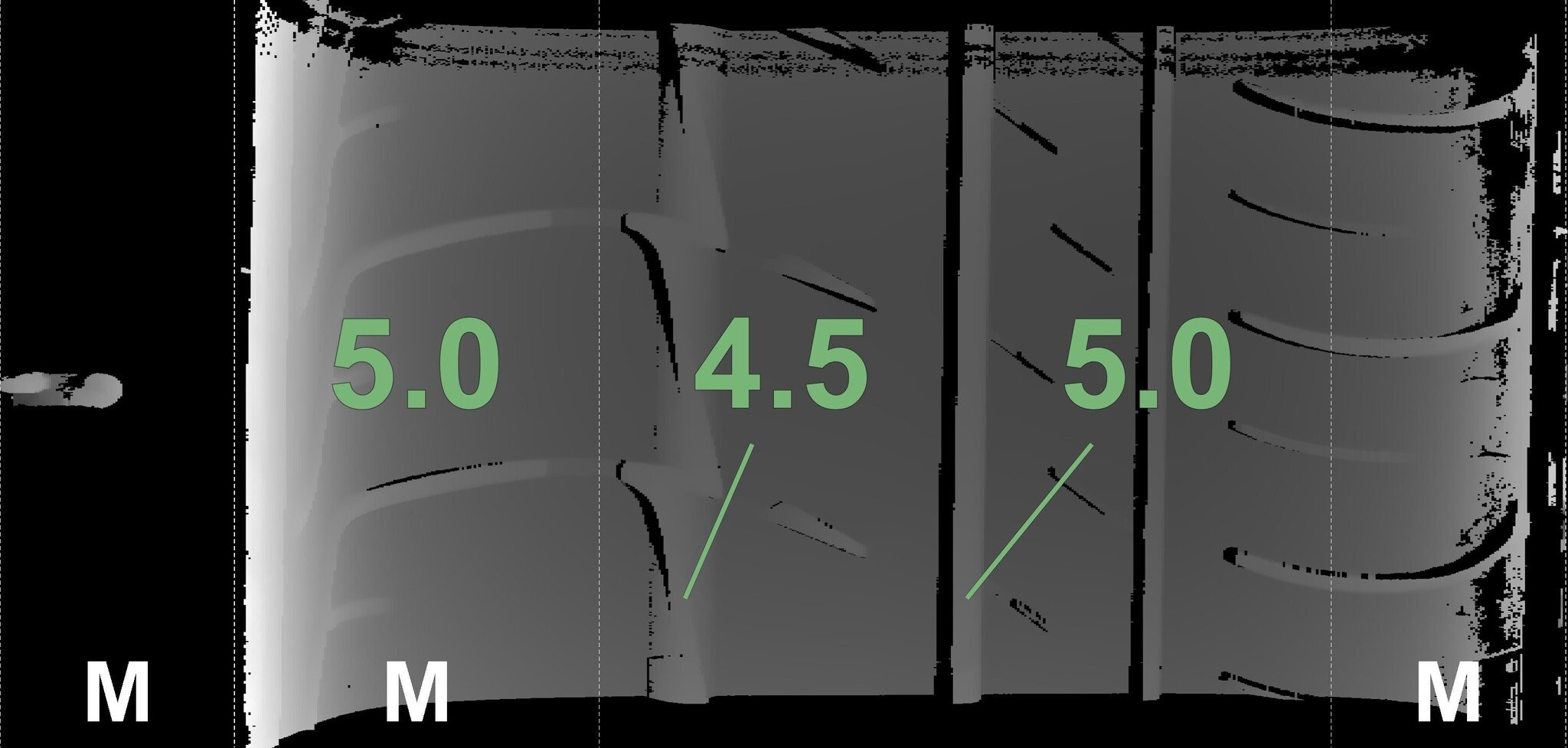 De gemeten profieldieptes en de details van de velgen zijn hierboven weergegeven.