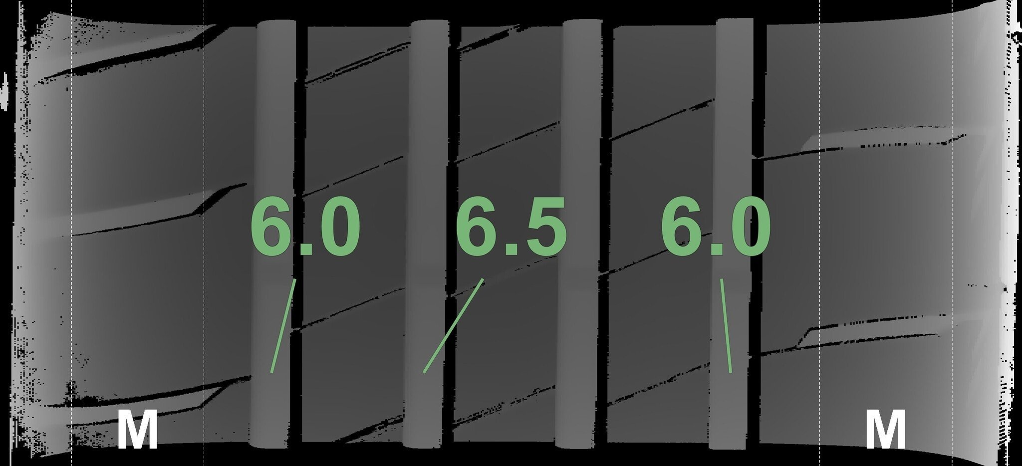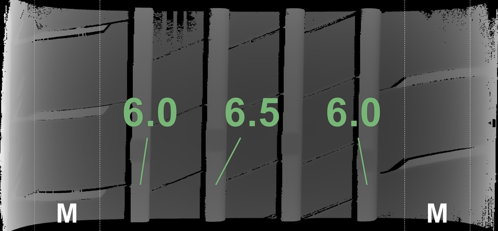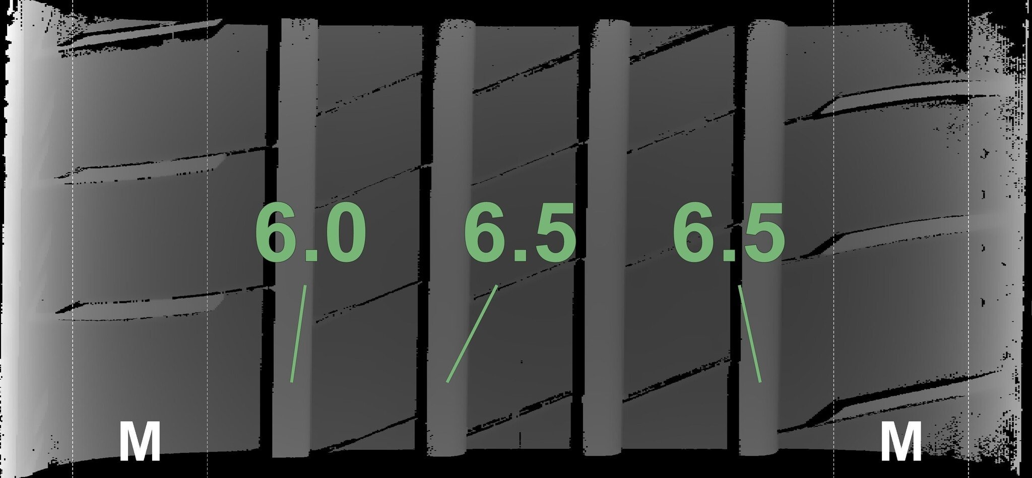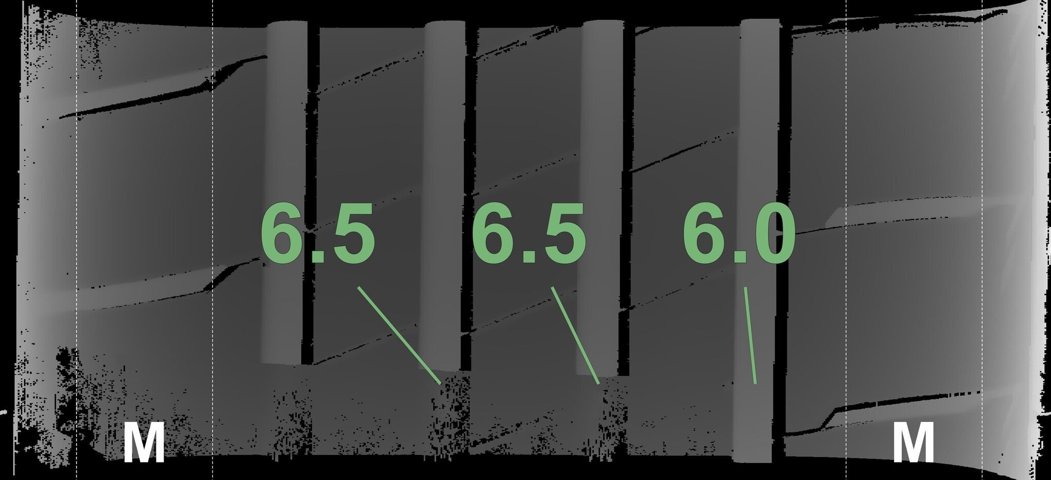 De gemeten profieldieptes en de details van de velgen zijn hierboven weergegeven.
