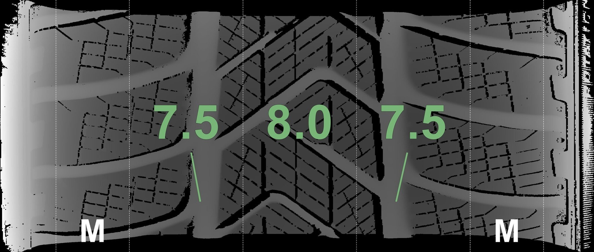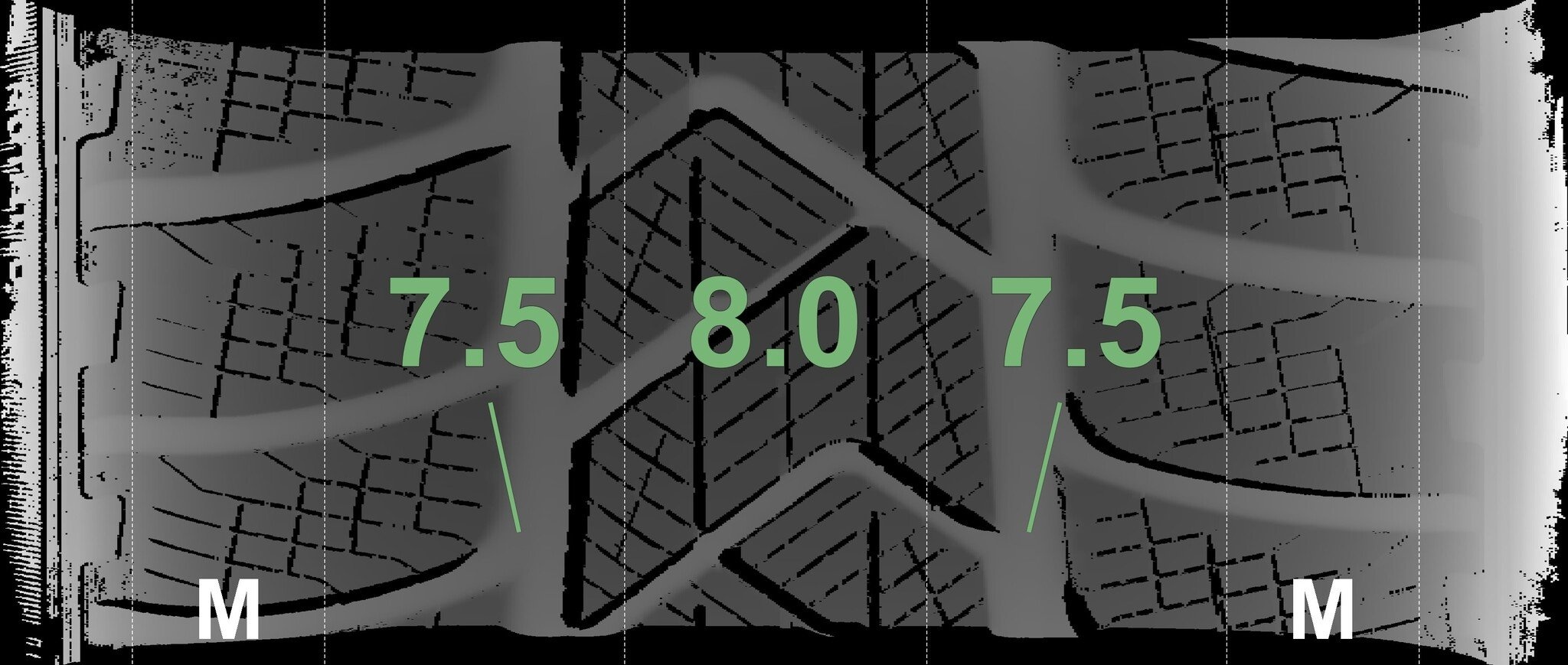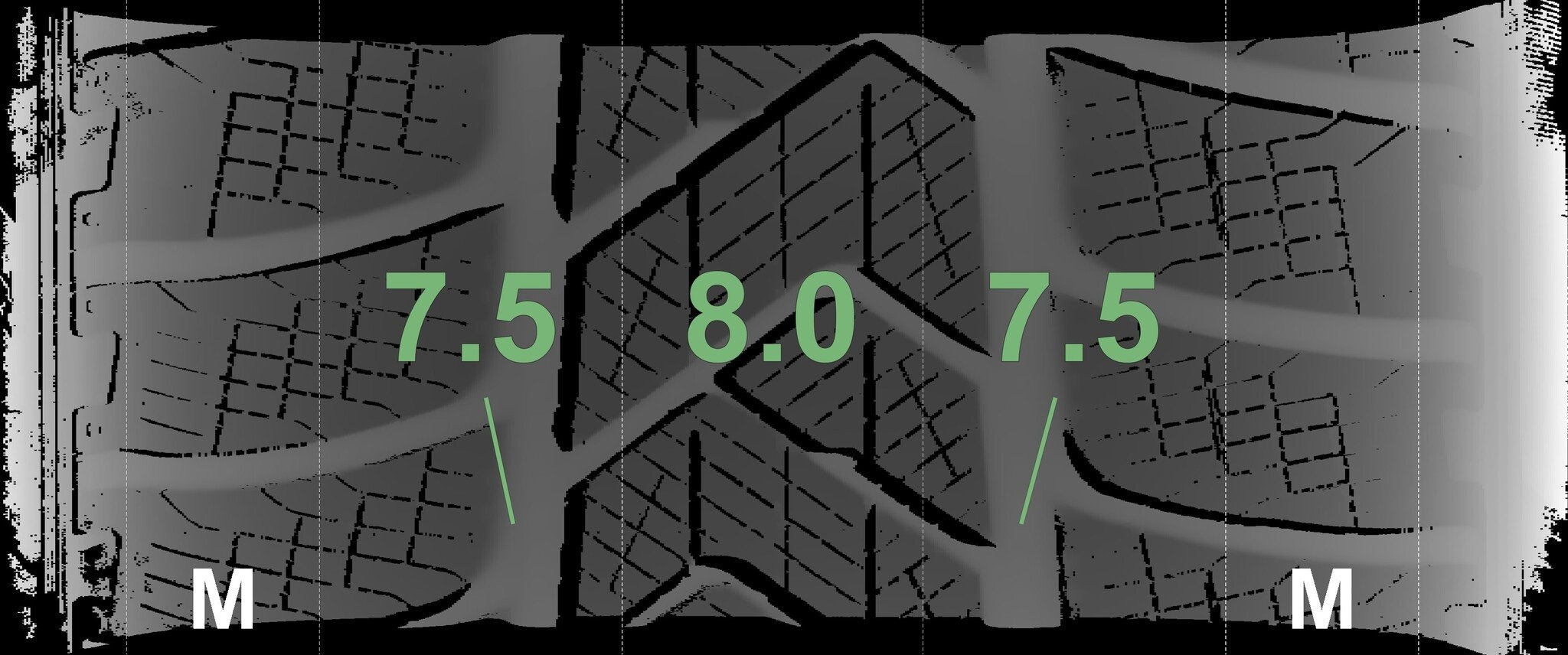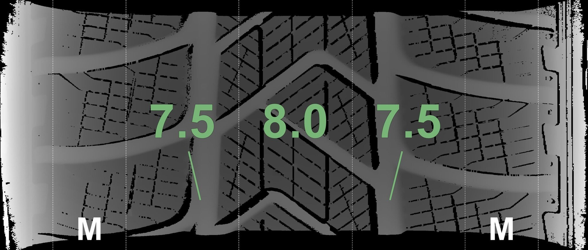 De gemeten profieldieptes en de details van de velgen zijn hierboven weergegeven.