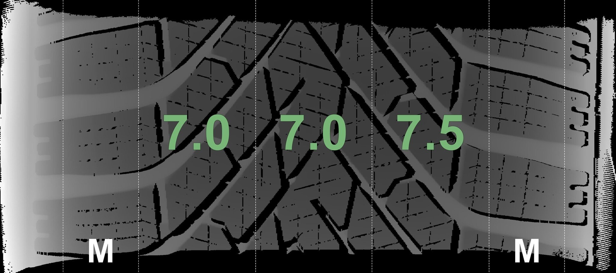 De gemeten profieldieptes en de details van de velgen zijn hierboven weergegeven.