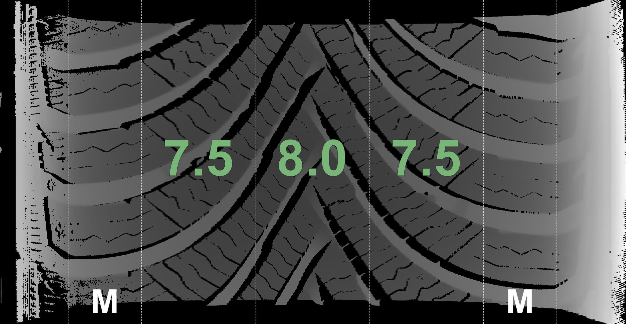 De gemeten profieldieptes en de details van de velgen zijn hierboven weergegeven.