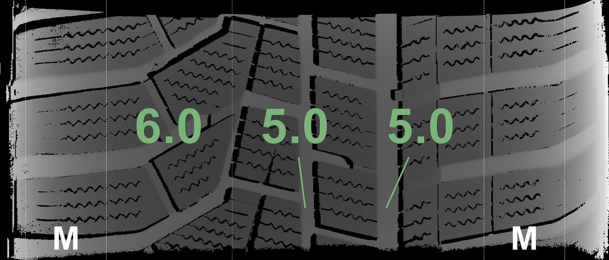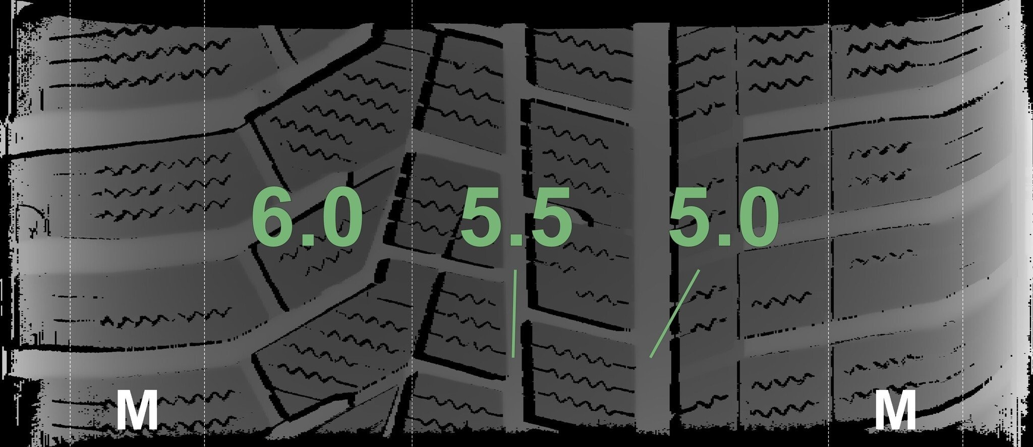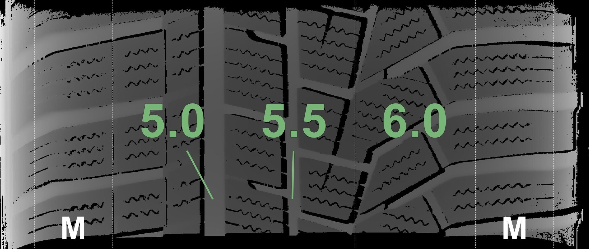 De gemeten profieldieptes en de details van de velgen zijn hierboven weergegeven.