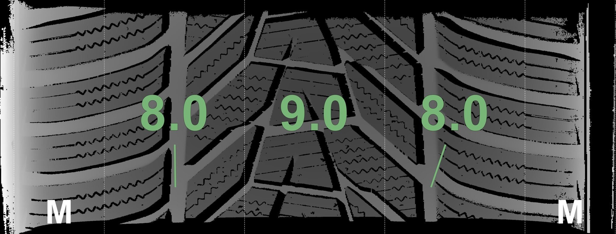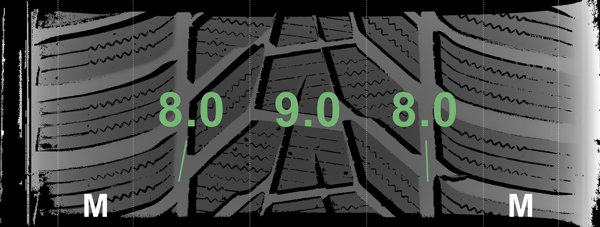 De gemeten profieldieptes en de details van de velgen zijn hierboven weergegeven.