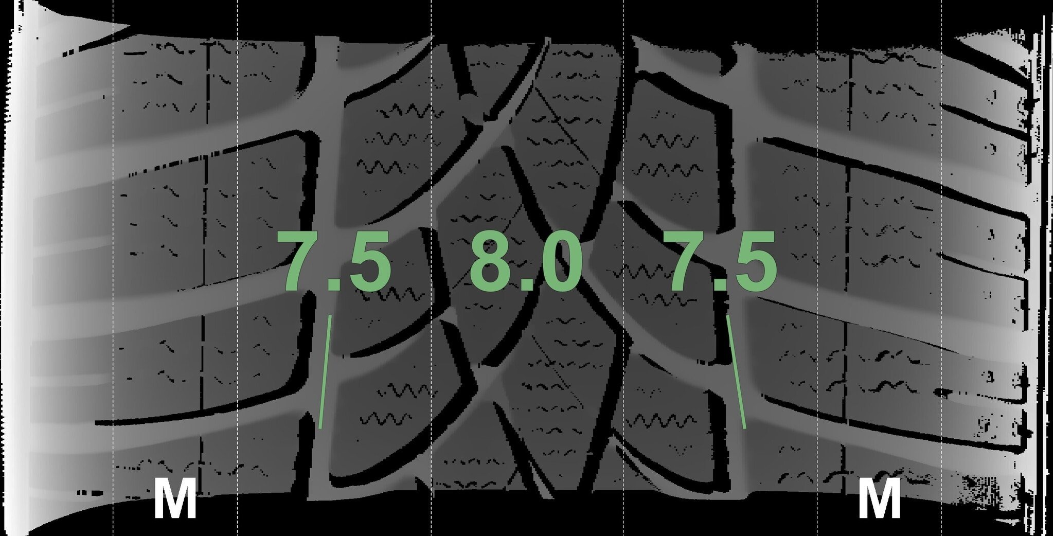 De gemeten profieldieptes en de details van de velgen zijn hierboven weergegeven.